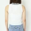 ネック部分の英字が一癖効いたカジュアルなタンクトップが登場★リブの生地で伸縮性があるので、暑い日でもストレス無く着れるのが嬉しいアイテム♪派手めなパンツやスウェットと合わせた流行りのY2Kコーデがオススメ◎