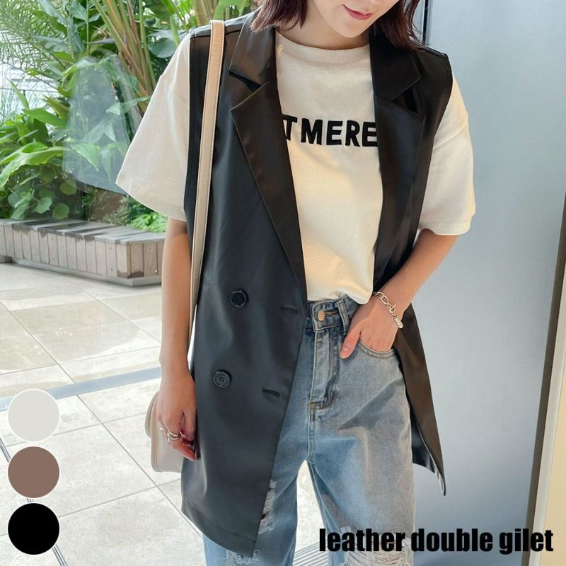 ダブルボタンが可愛らしく大人な合皮ダブルジレ登場★柔らかい風合いのフェイクレザー仕様が上品な仕上がり♪お持ちのTシャツはもちろん今季流行のシアートップスと合わせてもワンランクアップのお洒落コーデに◎