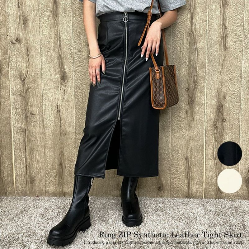 高見えして大人っぽいシンプルな出来栄えのリングZIP合皮タイトスカートが登場★透け感のあるブラウスなどに合わせるとよりオフィスカジュアル感が出てできる女風に♪合皮なので丈夫でしっかりしつつお手入れしやすいのがメリット◎