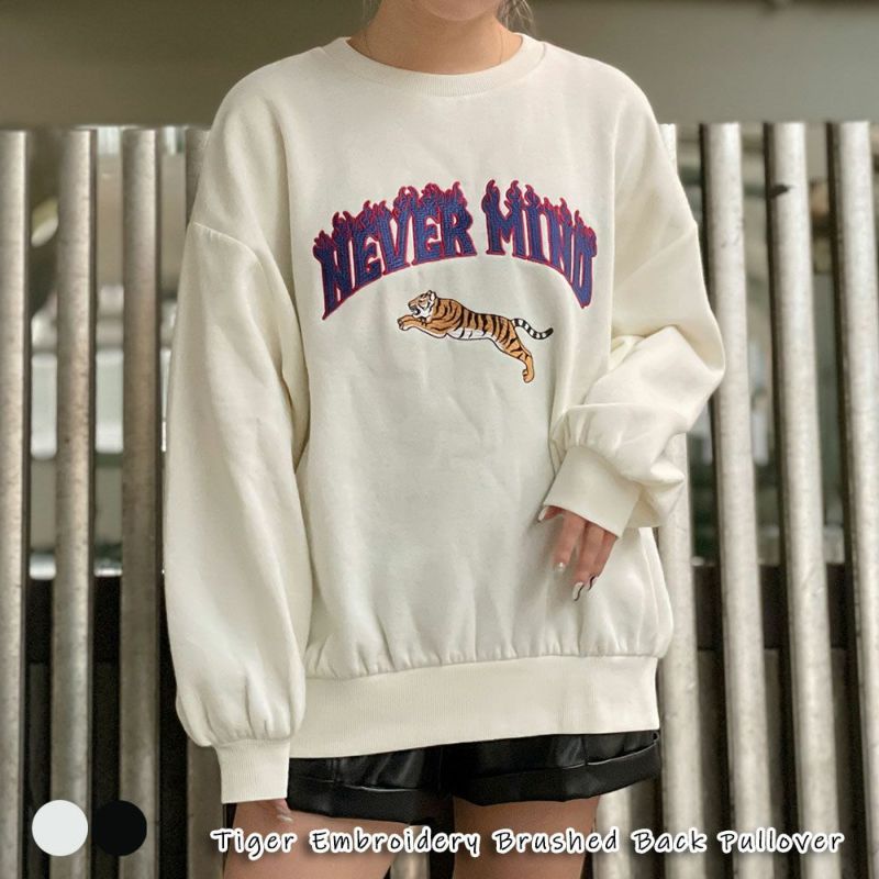 リアルなトラ刺しゅうがインパクト大な虎刺しゅう裏起毛プルオーバーが登場★印象的な刺しゅうを思わず見せたくなる可愛さ♪☆昨年から引き続きトレンドのゆるトレーナーとしてこれ一着でコーデにトレンド感をプラス☆普段着ないような柄に挑戦してみるのも◎