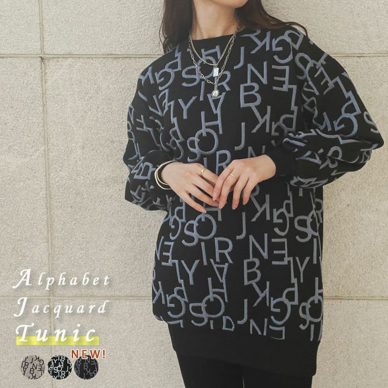 インパクトのある英字柄のあったかジャガード編みプルオーバーが登場★英字ロゴのコントラストがかわいいプルオーバー♪着るだけでコーデに存在感をプラス☆ヒップラインまで隠れるサイズ感のチュニックタイプなので下半身を細く魅せる効果も♪