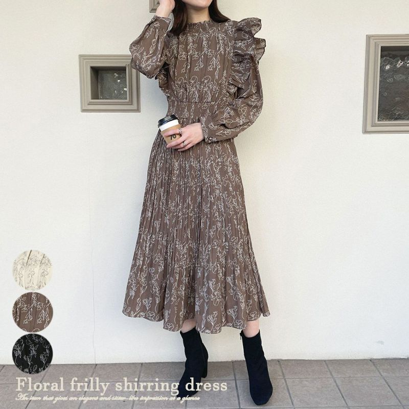 手描きイラストのようなデザインがキュートな花柄フリルシャーリングワンピースが登場★上品でお姉さま風の印象が一目でつくアイテム♪カジュアルランチも少しかしこまった席も着ていける◎肌寒い時期からは重めのアウターで甘辛MIXもGOOD☆