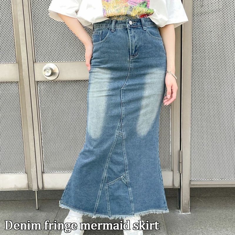 リメイクしたようなデザインのマーメイドスカートが登場★裾のフリンジ&ダメージ加工が抜け感たっぷり♪バックスリット入りで足さばきも◎腰まわりは、ややハイウエストですっきりと女性らしい絶妙なシルエットで、シーズンに合ったインナーをコーデすれば簡単にスタイリングが決まります☆