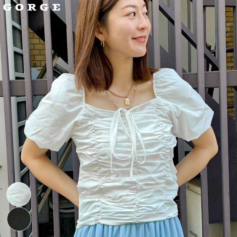 くしゅっと感が可愛いシャーリングブラウス。スクエアネックデザインなので首元をすっきりと華奢見えも叶う1枚。1枚で着るのはもちろん、シアートップスなどとレイヤードするのもおすすめ。デニムやカーゴパンツと合わせたカジュアルなスタイリングが今っぽい♪