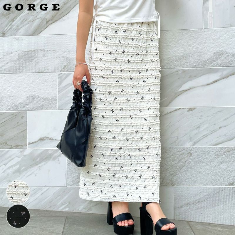 リボン柄がアクセントになったフリルをたくさんあしらったナロースカート。ボディラインを美しく魅せるストレートシルエットで品の良い印象に。ウエストはゴム仕様でストレスフリーな履き心地を叶える。