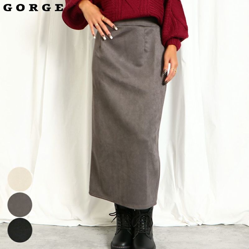 すっきり縦ラインで美シルエットが叶う、スエード風ロングスカート。