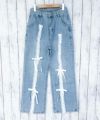 フロントにあしらわれた繊細なレースが、存在感たっぷりのアクセントに。さらに、レースの上に結ばれたリボンがガーリーさを引き立てます。ストレートシルエットで体型を選ばず、ゆったりと穿けるのも嬉しいポイント。