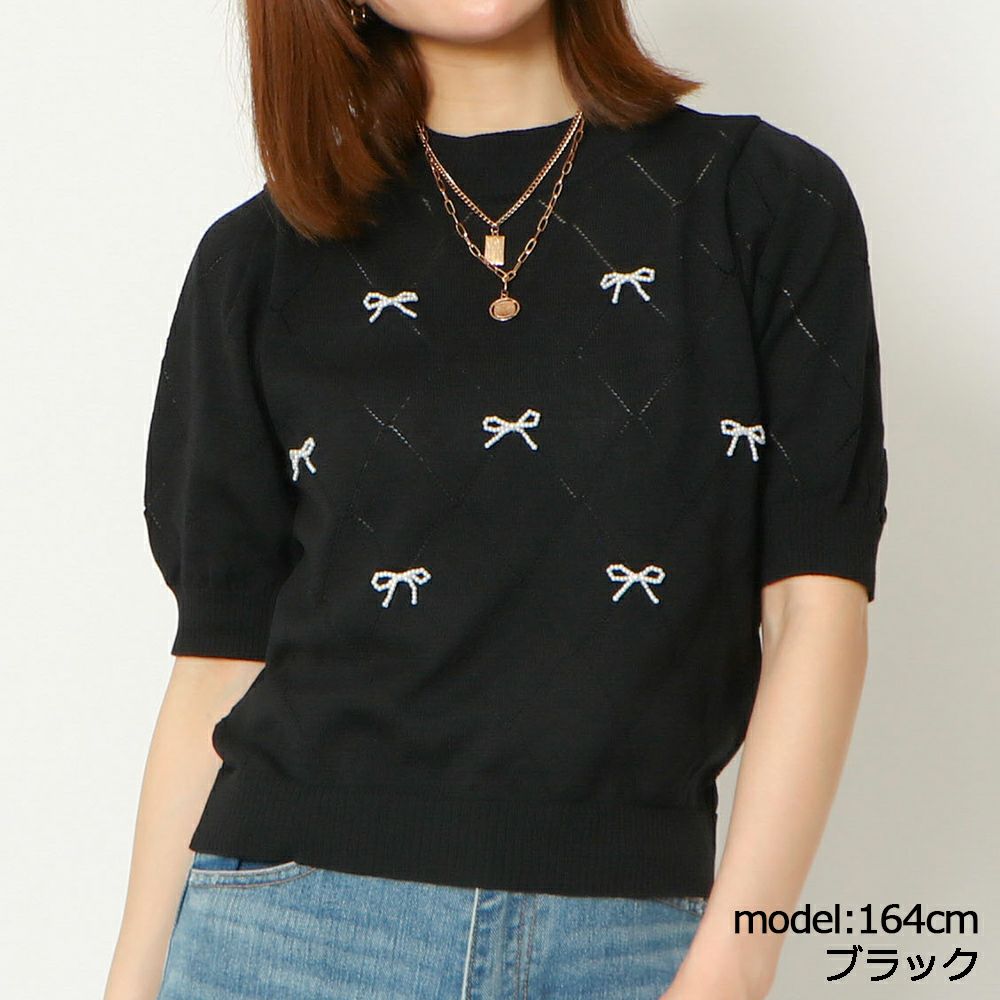 パールリボン半袖ニットプルオーバー