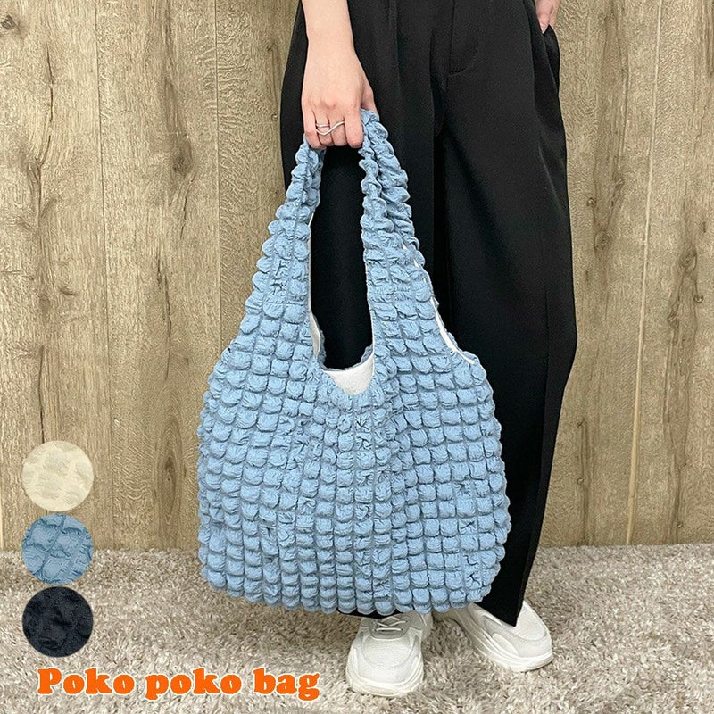 コーデの主役にもなれるポコポコバッグが登場★凹凸の生地が存在感のあるアイテム♪柔らかくて軽い素材なので持ちやすく気軽に使えるのも魅力◎シンプルなデザインなのできれいめからカジュアルまで幅広いコーデに合わせていただけます☆