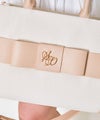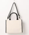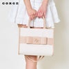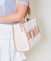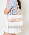 キャンバス生地と合皮のディテールが高見えポイント。中央にあしらわれた立体的なリボンが、シンプルながらも華やかさをプラスしてくれます♪ ロゴチャームも上品なきらめきを添えて、洗練された印象に。