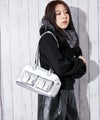 光沢感のあるフェイクレザー素材を使用し、上品さと程よいモード感を両立。フロントにあしらわれたベルト付きポケットが立体感を生み、バッグ全体に動きをプラスします。ラウンドフォルムと長めの持ち手で、手持ちも肩掛けもバランス良く決まります。