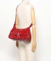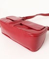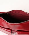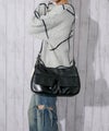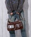 程よい光沢感のあるフェイクレザーを使用したレッグショルダーバッグ。フロントに施されたポケットデザインがアクセントになり、シンプルながら存在感のある仕上がり。