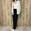 胸元のクロスラインが視線を集め、シンプルながらおしゃれな印象に。