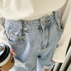 タックが入ったようなデザインに見える調整フック付き調整付きダメージデニムパンツが登場★オールシーズン履けるダメージパンツ♪サイズの調整がお洒落にさり気なく出来ちゃう◎フックに引っ掛けると自然にヒップにボリュームが出るのでウエストがより引き締まって見えてスタイルアップになります☆