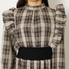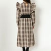 袖に輝く細やかなパールが綺麗なチェックウエストリブワンピースが登場★大きな肩フリルが印象的で上品♪ウエストに伸縮性があるのでキュッと締まってスタイルアップ◎カジュアルランチなど少し畏まった場所へも着れちゃいます☆