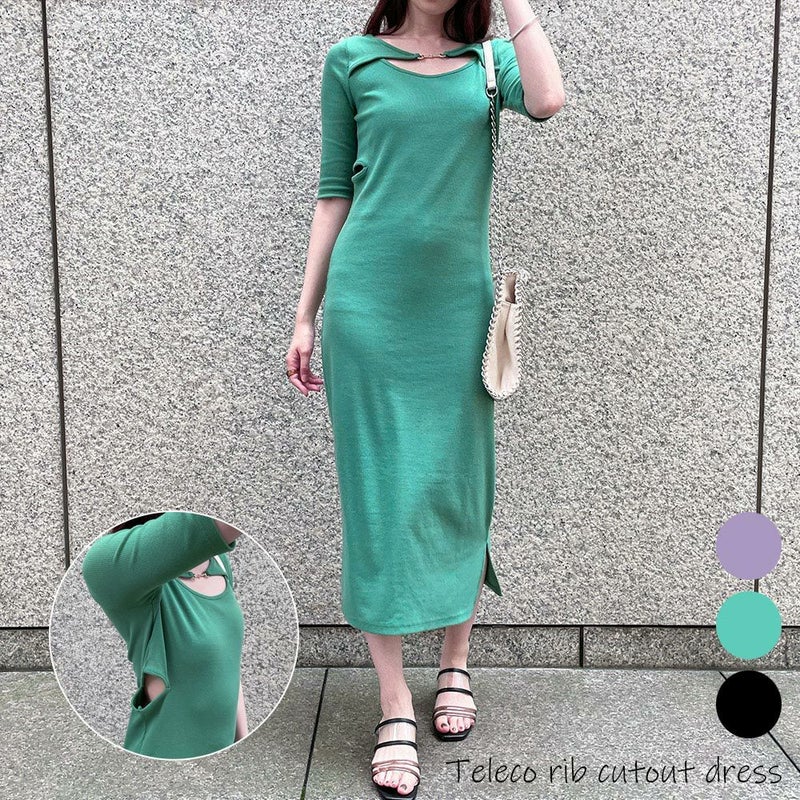 ややタイトめシルエットにビット付きデザインのテレコリブカットアウトワンピースが登場★肉感を拾わずタイトなシルエットを作るアイテム♪私服オフィスやカジュアルランチなどにオススメのメインワンピです◎