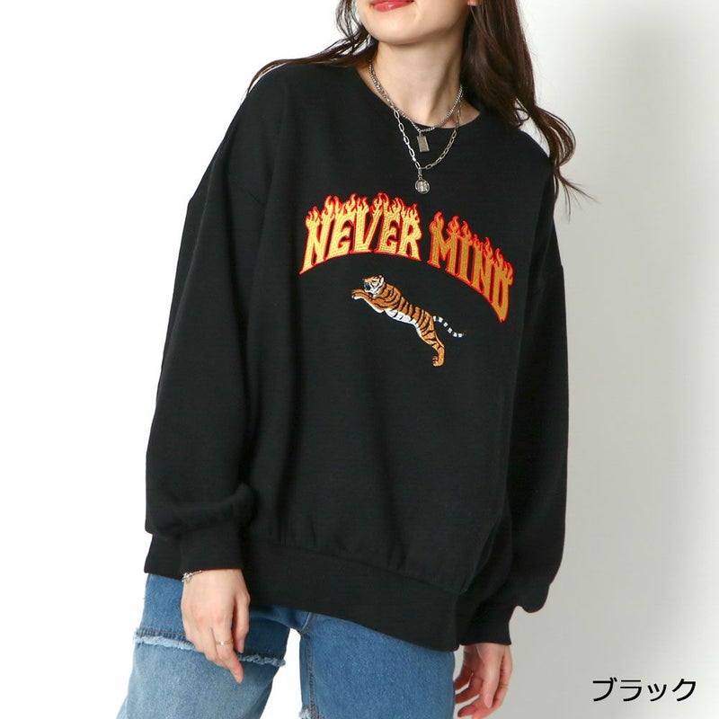 リアルなトラ刺しゅうがインパクト大な虎刺しゅう裏起毛プルオーバーが登場★印象的な刺しゅうを思わず見せたくなる可愛さ♪☆昨年から引き続きトレンドのゆるトレーナーとしてこれ一着でコーデにトレンド感をプラス☆普段着ないような柄に挑戦してみるのも◎