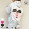 背中部分のグラフィックのような刺しゅうデザインがアクセントになるZIPパーカーが登場★バックスタイルがこなれて見えるのも嬉しいポイント♪デニムやツイルパンツ、ワイドカーゴパンツなどと合わせてとことんカジュアルスタイルにしたりフレアパンツやプリーツミニスカートなどと組み合わせてトレンドライクなコーデもおすすめ◎同素材で展開しているショートパンツ【2310152】とセットアップでご着用可能です☆