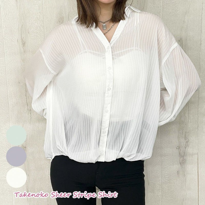 トレンドのストライプシャツにタケノコシアーシャツが登場★メンズっぽくなりがちなストライプシャツをシアー素材&タケノコタックにすることで可愛らしい仕上がりに♪シンプルにデニム+白Tシャツと合わせるだけでも可愛く決まり、使いやすいアイテムです☆