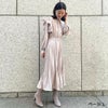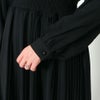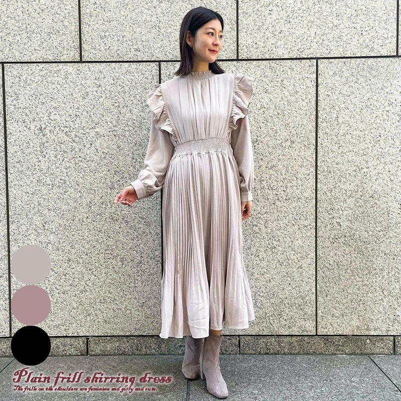 縦ラインのプリーツ加工がスタイルをスラっと細く長く見せてくれる無地フリルシャーリングワンピースが登場★肩のフリルが女性らしいガーリーな雰囲気でかわいい♪無地且つシンプルな色味なのでレースデザインのストールなどと合わせるとより大人ガーリーな印象にUP◎ブーツでもフラットやヒールシューズでも無理せず綺麗めに着れるワンピースです☆