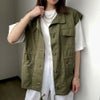 レイヤードスタイルに大活躍なミリタリーベストが登場★Tシャツやスウェット、ワンピースなどどんなアイテムとも好相性で、大人っぽいハイネックデザインも魅力♪いつものスタイリングに羽織るだけで今年らしいカジュアル感をプラス◎前を閉じて大人っぽく着こなしたり、前を開けてワンピースの上にサラッと羽織るだけでも◎1枚持っているとコーディネートの幅が広がります☆