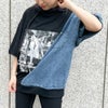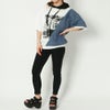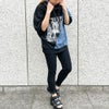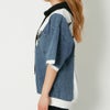 斜めに切り替えたケミカルデニムと転写プリントで個性派ルックに仕上げたパーカーが登場★エッジのきいたロゴデザインもクールなアクセントをプラス♪ボリュームのあるスリーブやオーバーシルエットで華奢見せ効果も期待大◎ショートパンツを合わせてワンピース風にスタイリングするのもおすすめです☆