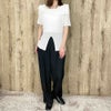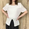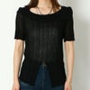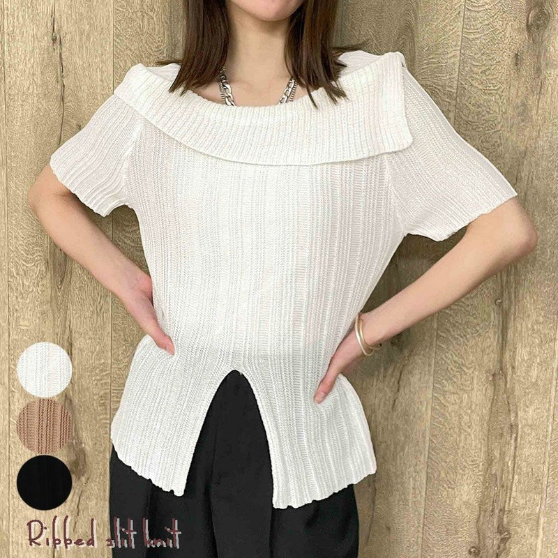 アシンメトリーなデコルテラインがお洒落なニットが登場★透かし編みでエアリーな印象に♪すっきりとしたシルエットで華奢見えを演出し気になる二の腕もカバー◎裾のスリットが表情豊かにしてくれるので、これ1枚でシンプルなスタイルもサマになる、優秀トップスです☆