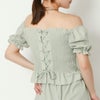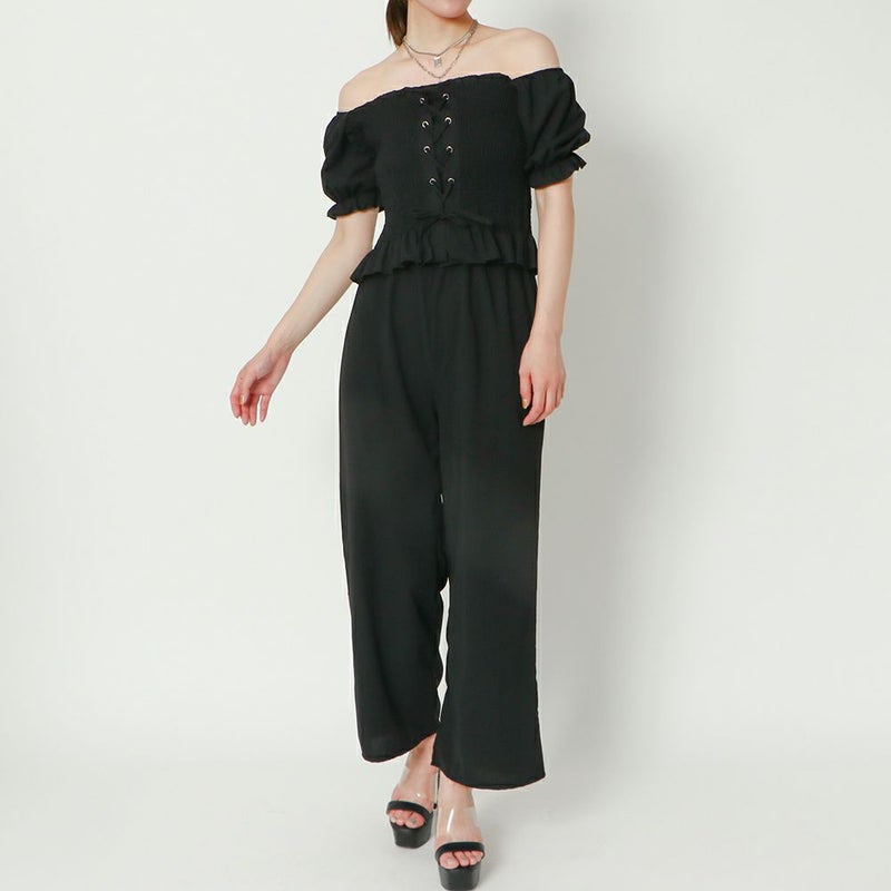 単品でも使えて着回し力抜群なセットアップの登場★フィット感のあるシャーリング加工に編み上げデザインでウエストをカバーし、すっきりと見せてくれます♪パワショルでも、オフショルでも2パターンの着こなしで楽しめる◎スポサンやペタンコサンダルを合わせれば、抜け感あるヘルシーなスタイリングにも変身です☆
