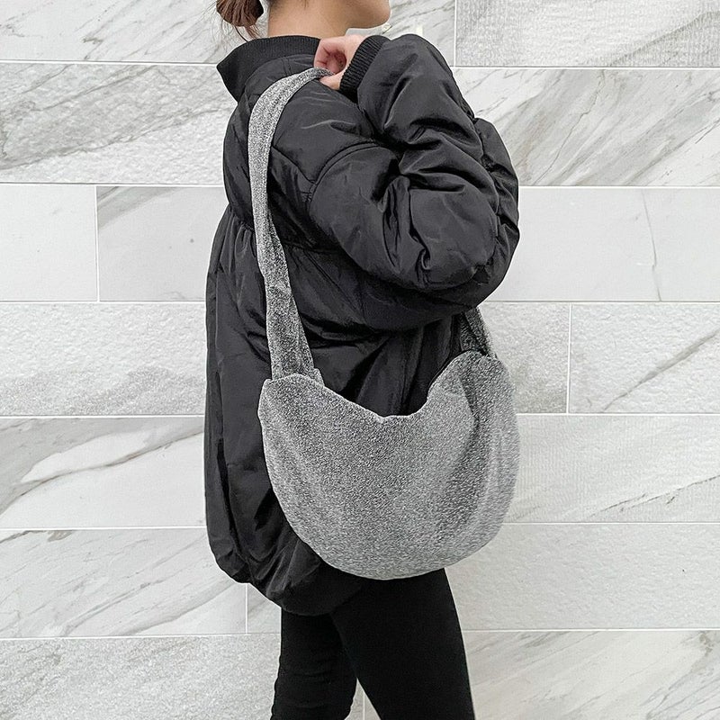 キラキラとしたシャイニーなラメ感が目を引くショルダーバッグ。