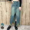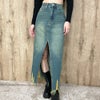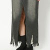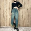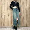 センターに大胆なスリットが入ったハイスリットデニムロングスカート。