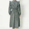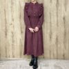 ふんわり広がるAラインシルエットとパフ袖にパール調ボタンが可愛らしさをプラス。