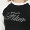 配色のラグランデザインがアクセントとなった、1枚で決まるクロップド丈のロンTが登場★フロントにあしらったラインストーンのロゴがレディなアクセントを添えるアイテム♪コンパクトなサイズ感で女性らしいシルエット◎デニムはもちろん、カーゴパンツやショートパンツとの相性がよくストリートからカジュアルまで幅広く着ていただけます☆