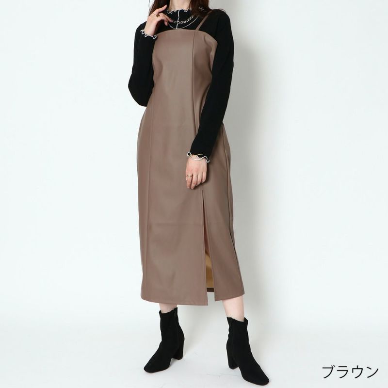 大人っぽく秋らしいキレイめキャミワンピ!合皮スリットワンピースが登場★晩夏から着れる手入れのしやすい合皮素材ワンピ♪ウエスト後ろゴムで自然に引き締めてくれるのでスタイルアップも☆カフェデートなどに今らしいルックスです◎