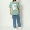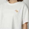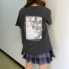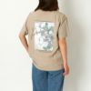 ロマンティックなバッグ転写プリントTシャツ。フロントデザインは胸元刺しゅうでシンプル。バックは雑誌風デザインを転写プリントしアクセントに刺しゅうも施されたインパクト大なデザイン♪コットン100%の着心地の良い生地感でオンにもオフにも使える一着。