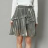 大人のかわいさを醸すシャイニーミニスカート。プリーツを施したティアードデザイン。大人っぽく楽しめるように、プリーツ幅は細かく、洗練されたムードに仕上げました。たっぷりの生地感とイレヘムデザインから生まれる、ドラマティックな揺れも魅力的。ウェストゴムで着脱も簡単。