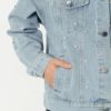 これからの季節に大活躍ビジューが華やかなデニムジャケット。ウォッシュ加工のスタンダードなデニムジャケットにビジューを付けることによって華やかさをプラス★少し大きめな身幅でリラクシーな着心地が楽しめる飽きの来ないアイテムです♪