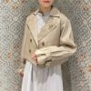 季節の変わり目の羽織りにちょうどいい、裏地の無いショートトレンチジャケット。袖口のキャンディースリーブやバックスタイルのプリーツ切り替えで、マニッシュになりがちなトレンチをフェミニンな印象にアップデート。襟元の開きを大きく設定する事で、顔周りをスッキリ見せてくれる効果も◎付属のブローチ華やかなインパクトもプラス。