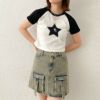 大きめカーゴ風のポケットがアクセントになったデニムミニスカート。緩めのAラインシルエットで、ウエストにはバックゴムを使用し、ストレスフリーな履き心地が嬉しい◎クロップドトップスやメッシュトップスを合わせてトレンド感あるスタイリングが楽しめます◎