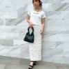 リボン柄がアクセントになったフリルをたくさんあしらったナロースカート。ボディラインを美しく魅せるストレートシルエットで品の良い印象に。ウエストはゴム仕様でストレスフリーな履き心地を叶える。