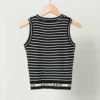 裾のロゴがポイントのボーダーニットタンク。しなやかにボディーラインに沿うシルエットで、女性らしい着こなしを叶えてくれます。ショート丈のデザインでデニムやワイドパンツと合わせても可愛い☆レイヤードスタイルのインナーとしても◎