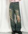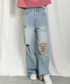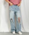 《きらクラッシュ×ラインストーン》レディース ダメージデニム ワイドパンツ 体型カバー 春夏秋冬
