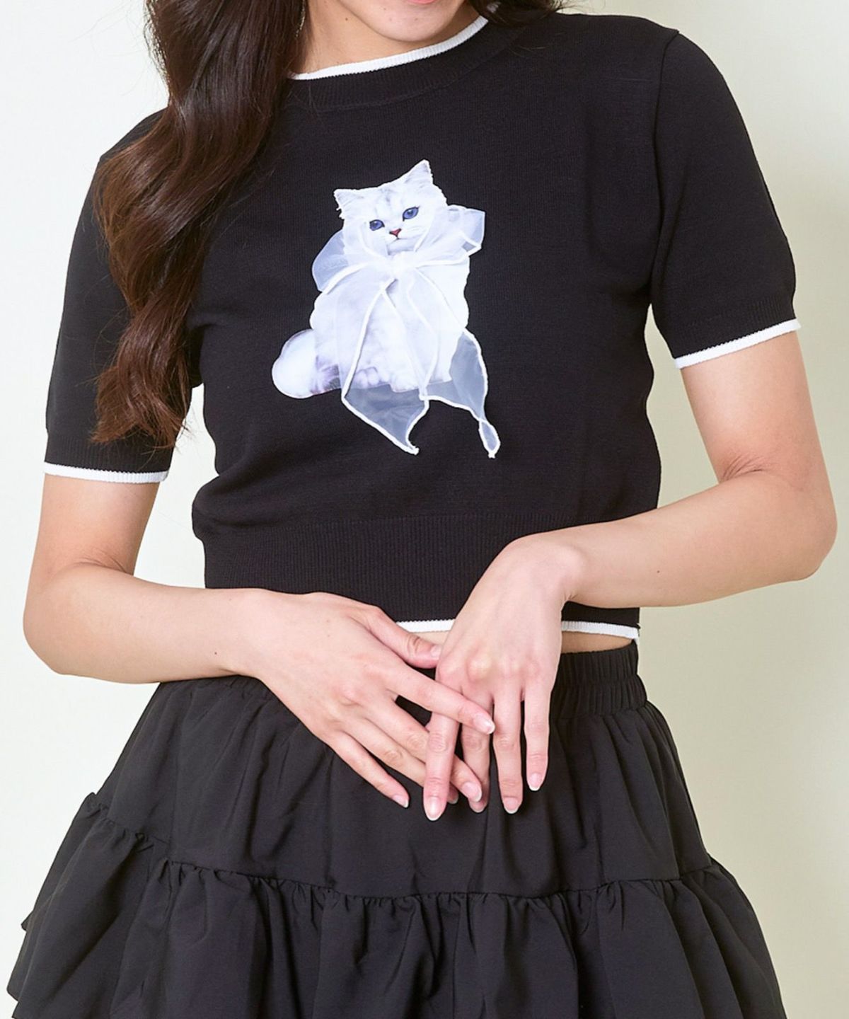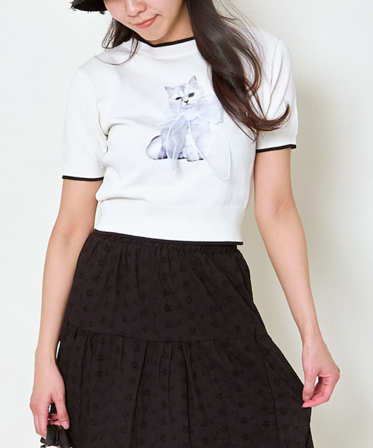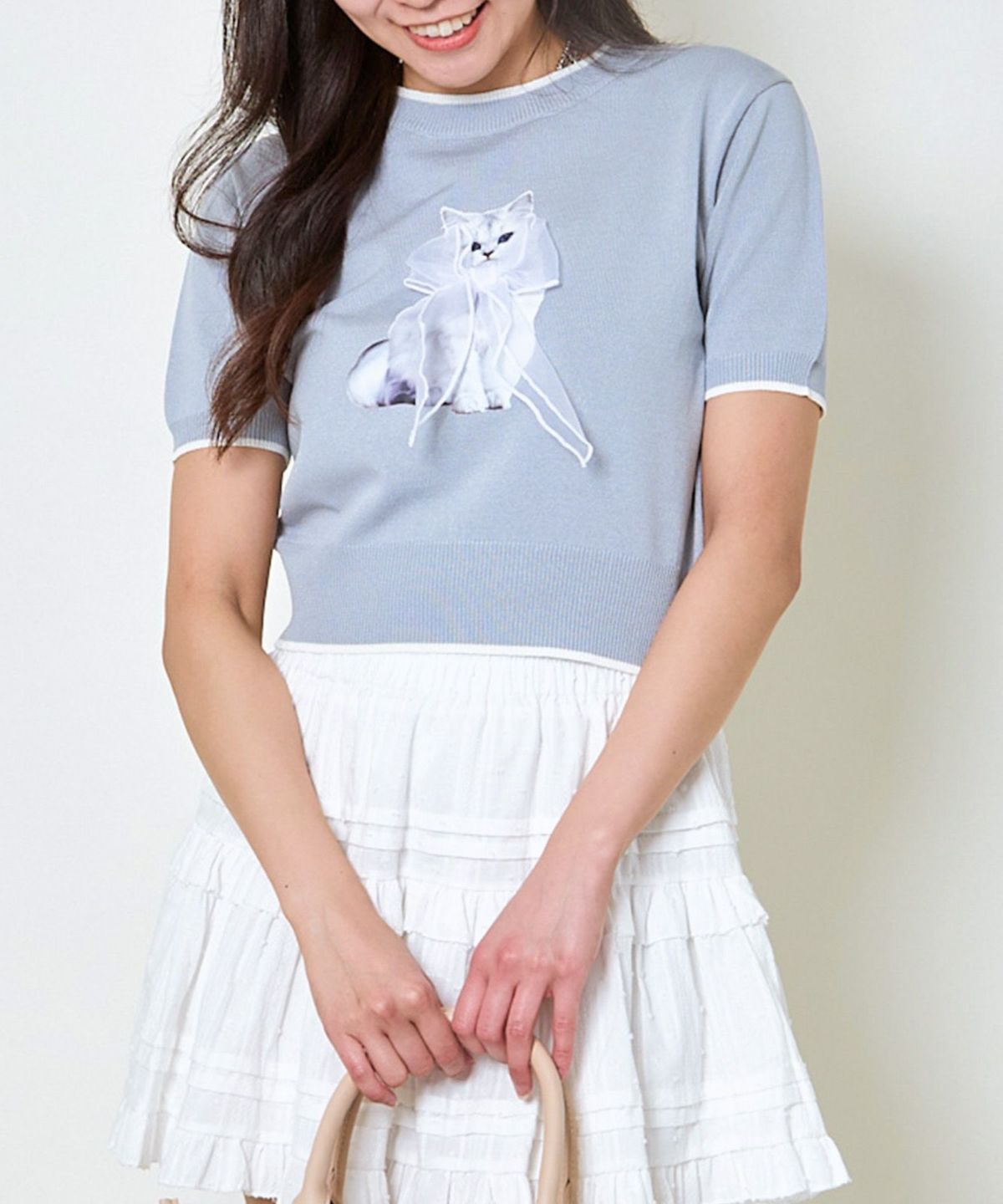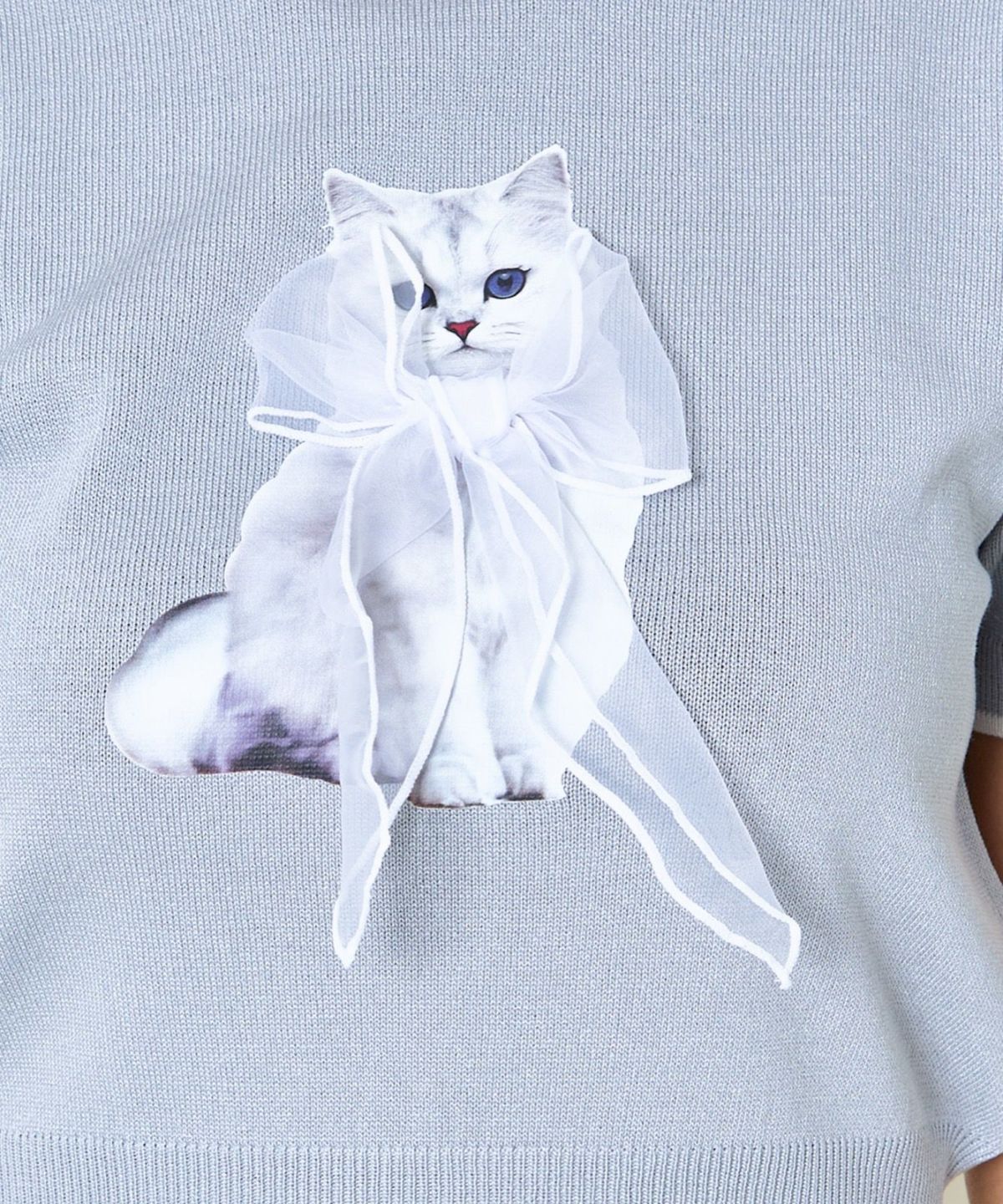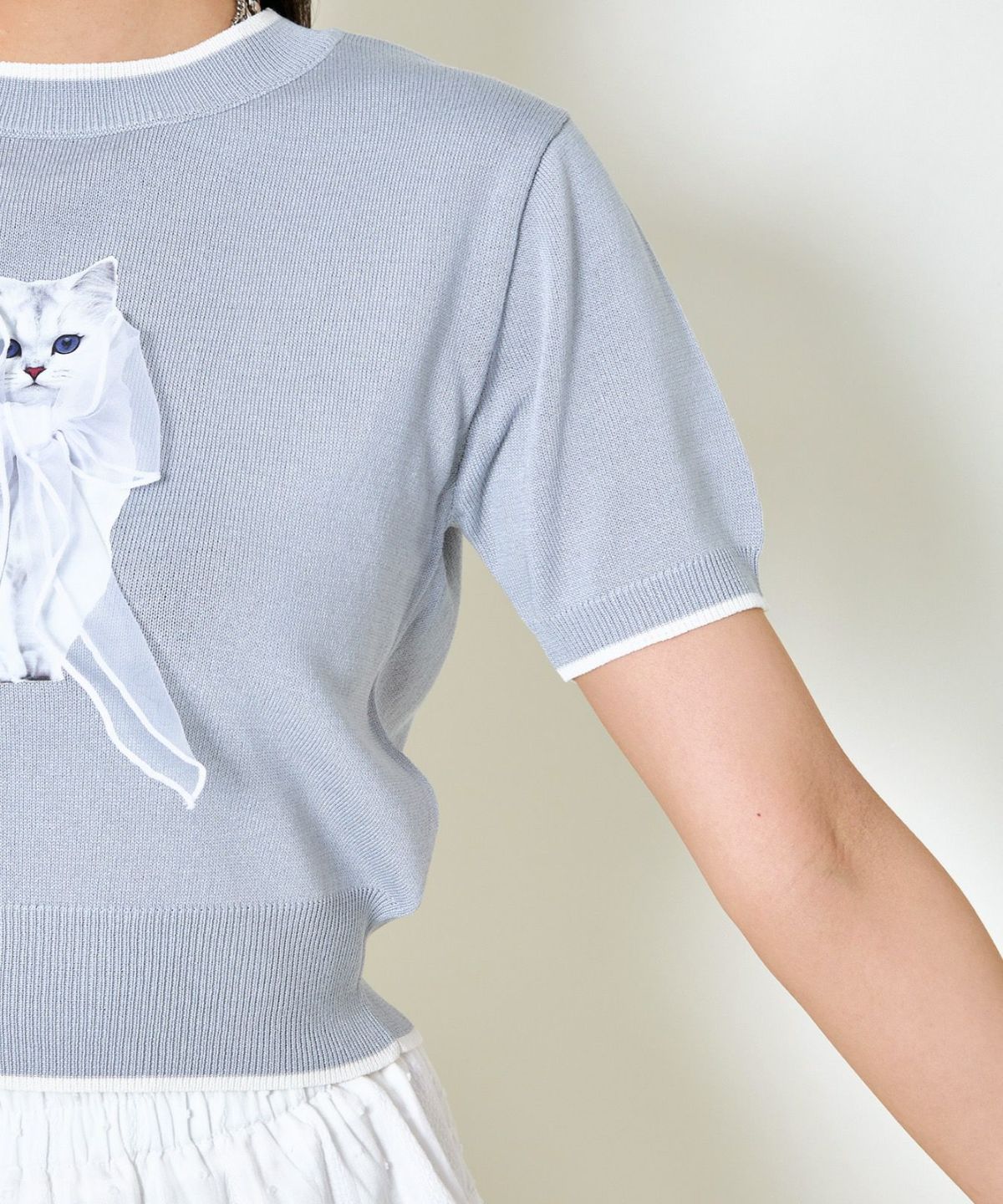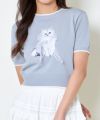 オーガンジー付き猫半袖ニットプルオーバー