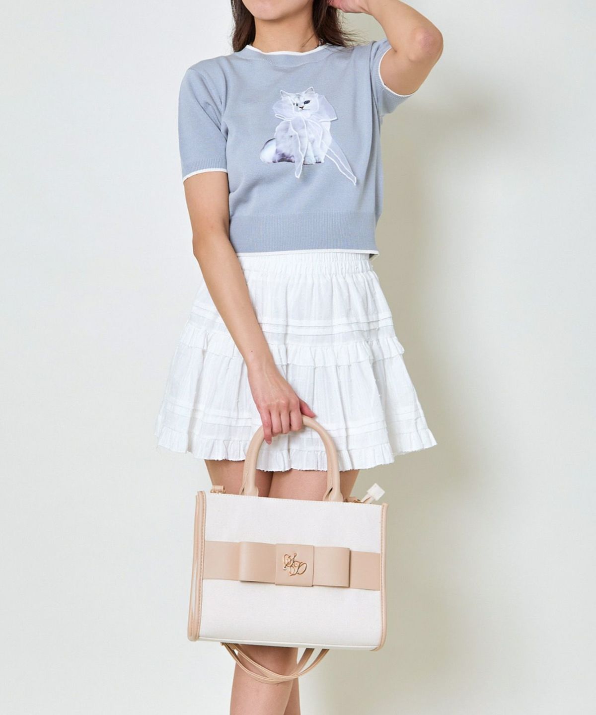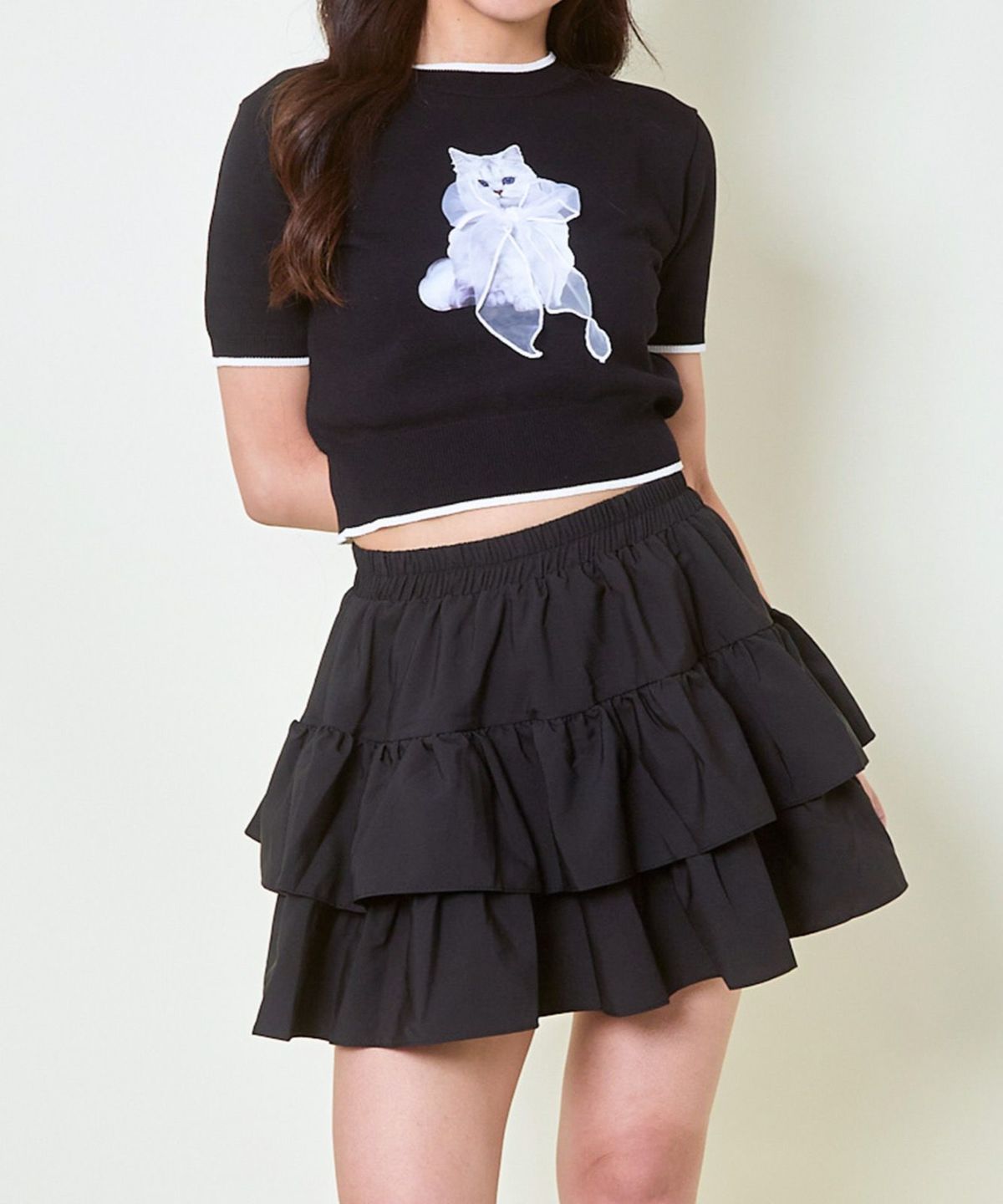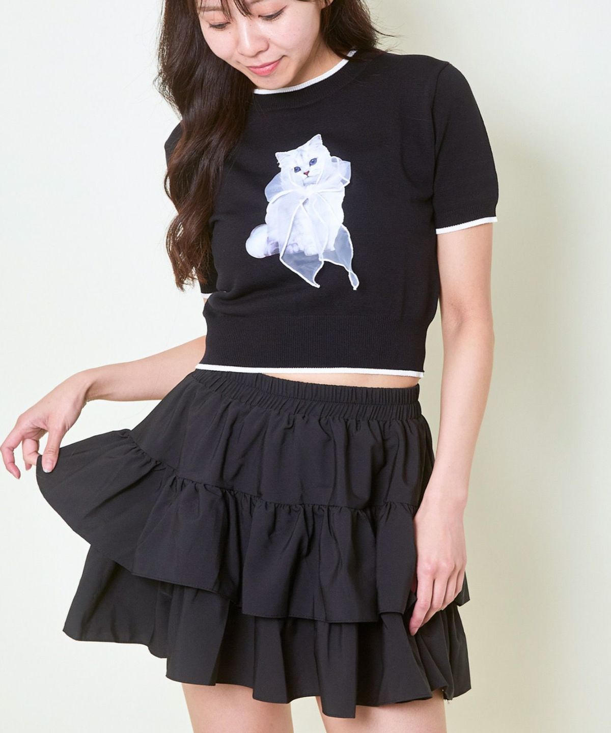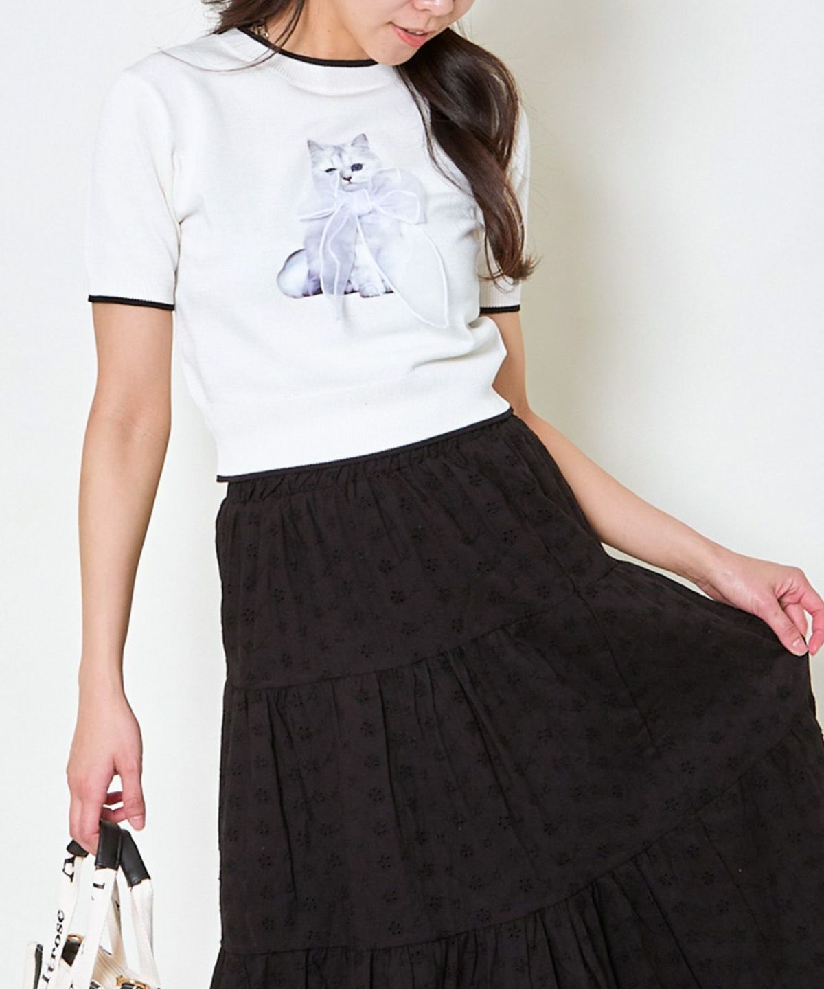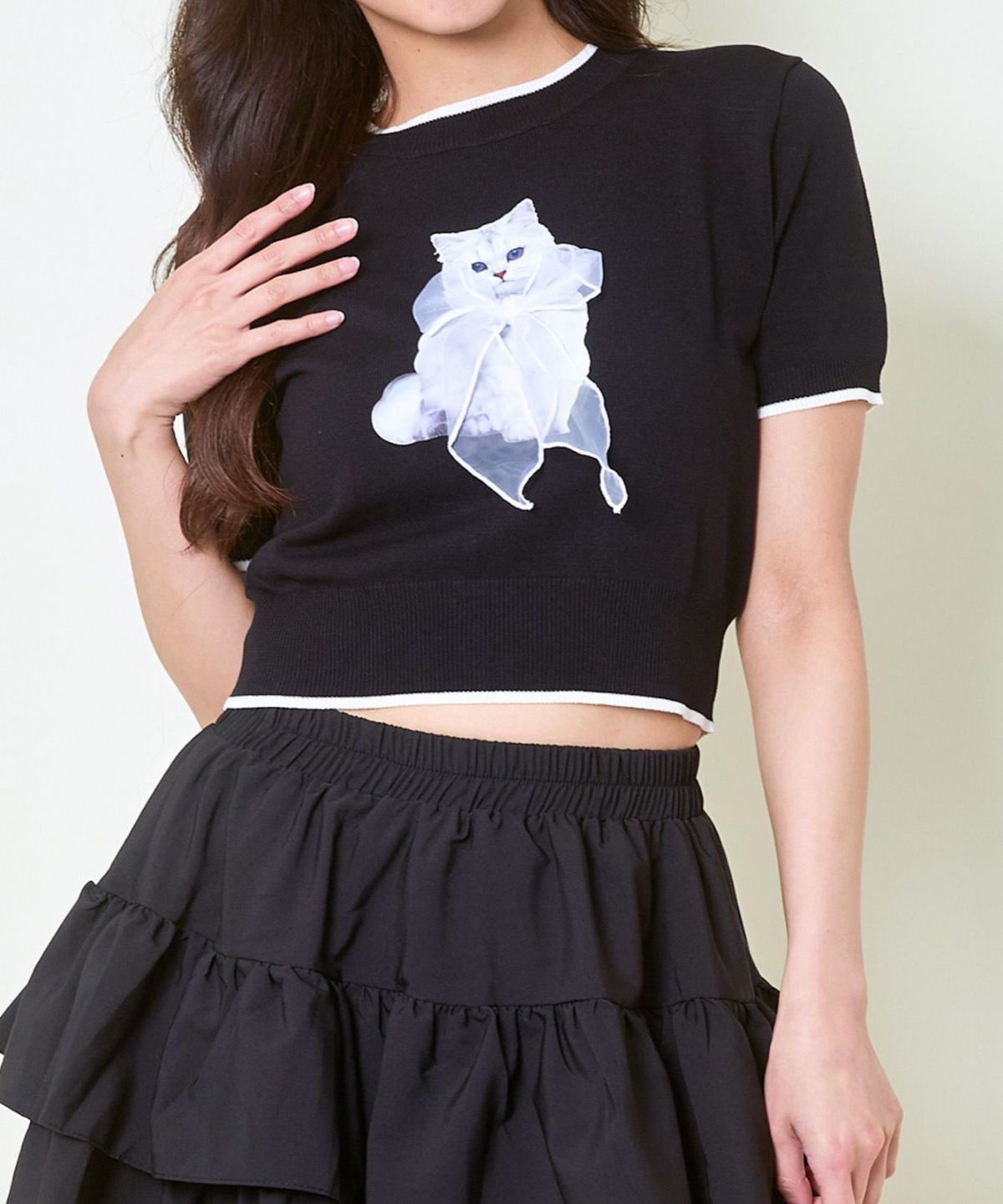 オーガンジー付き猫半袖ニットプルオーバー