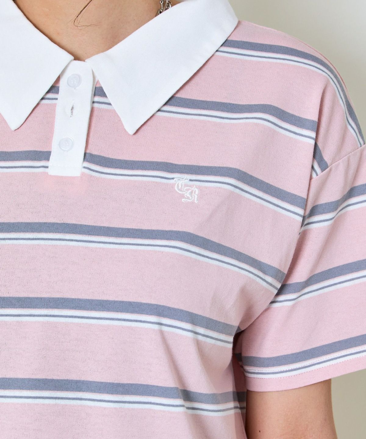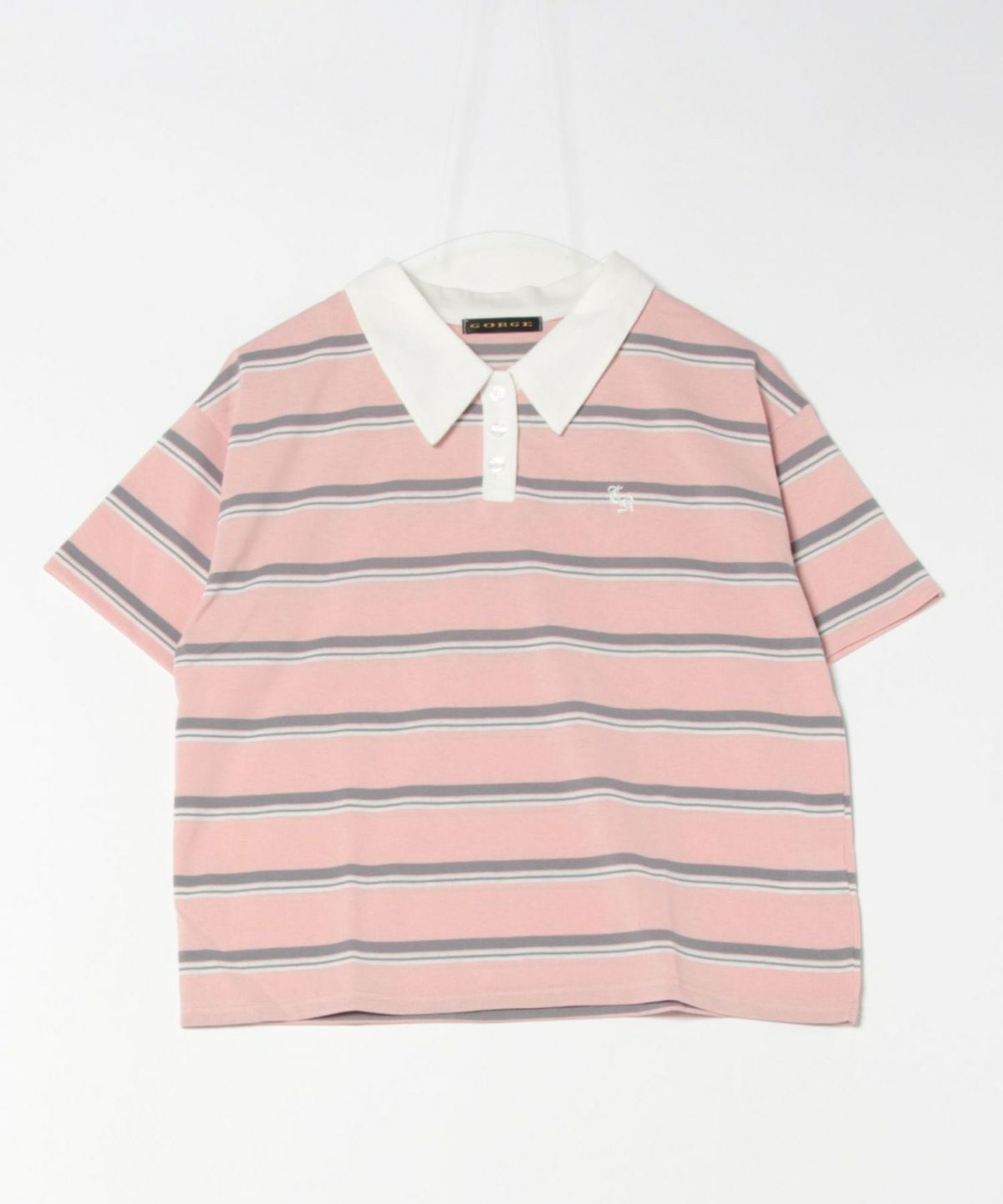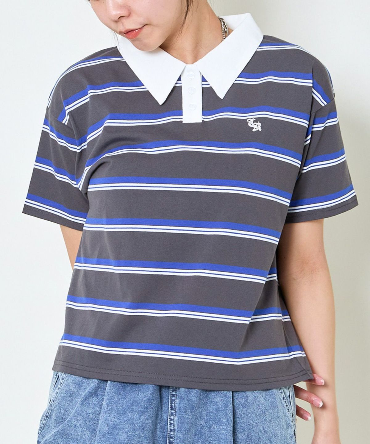 ボーダーポロ襟刺繍半袖Tシャツ