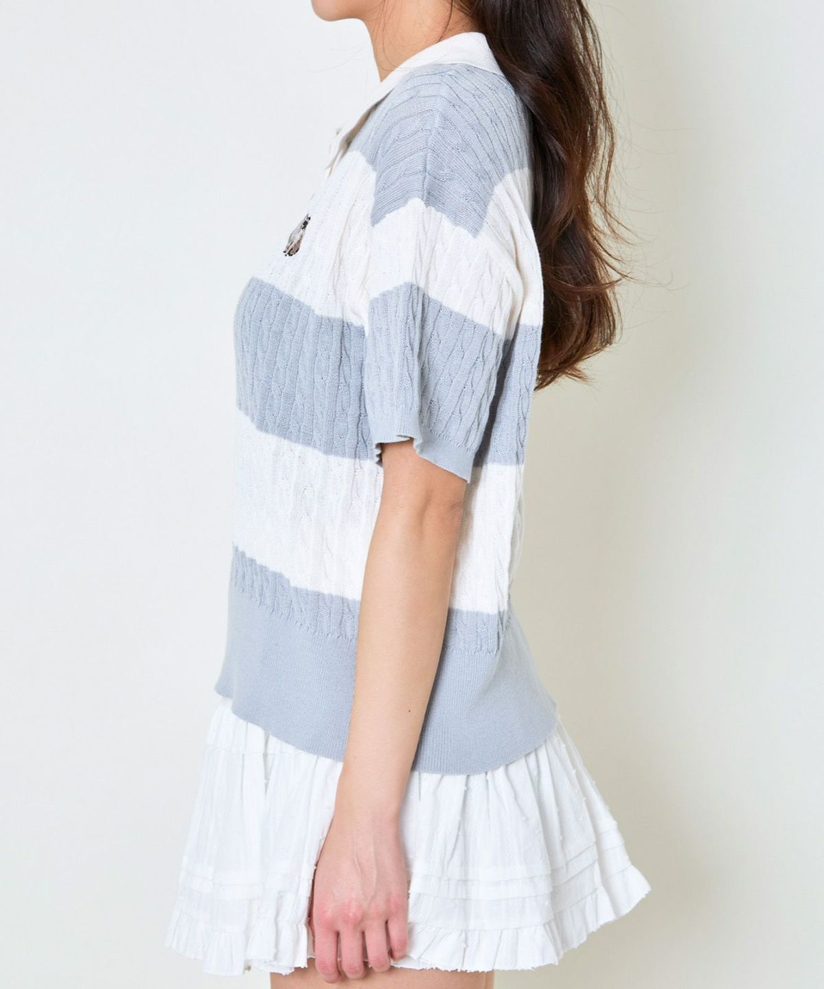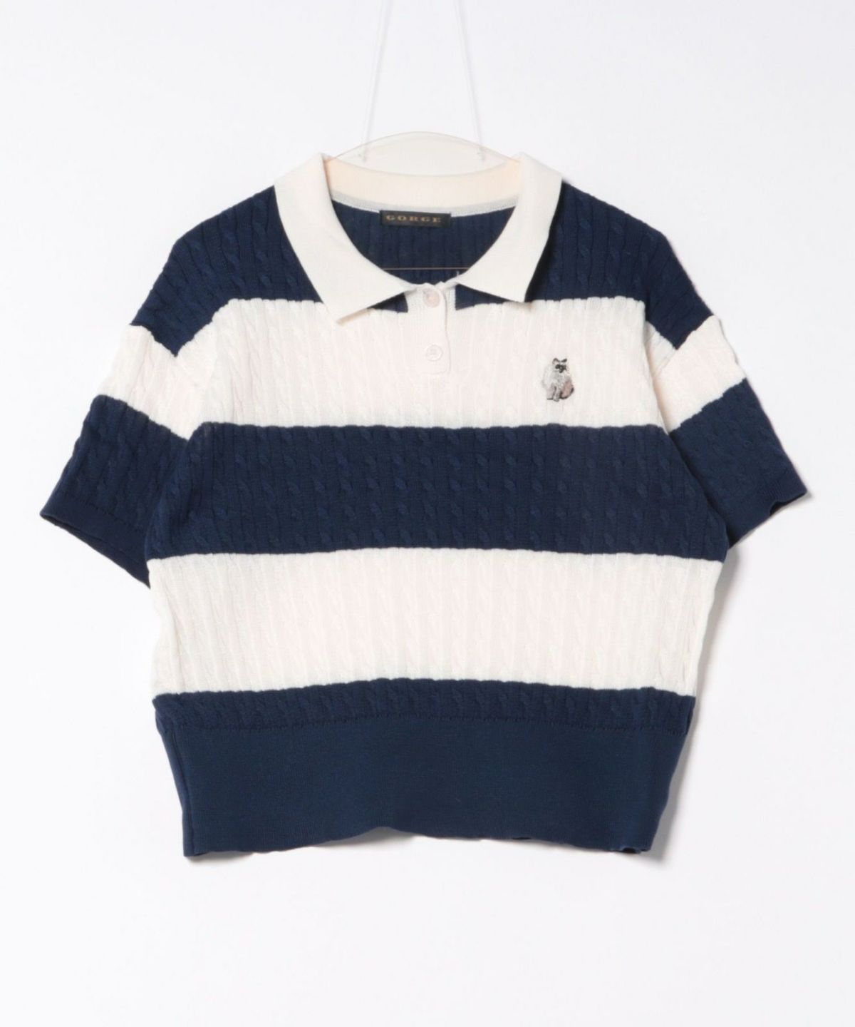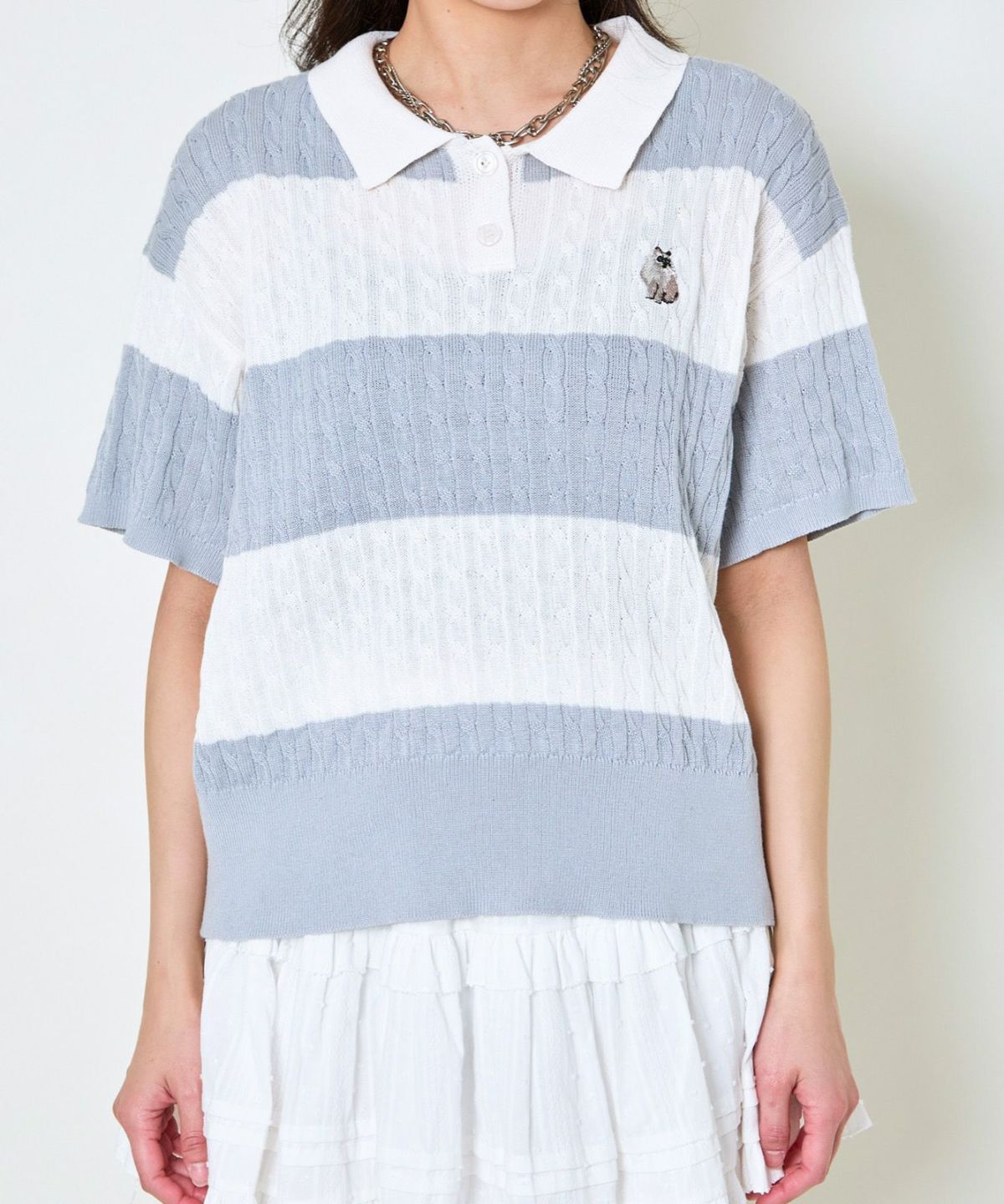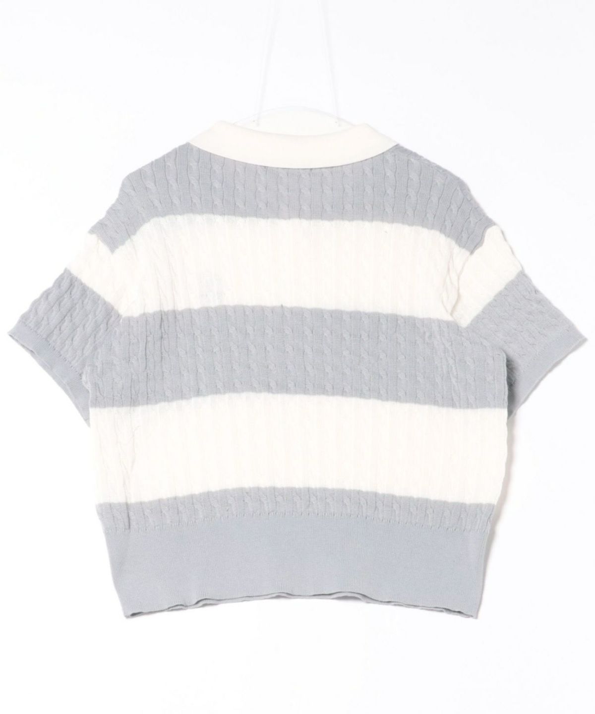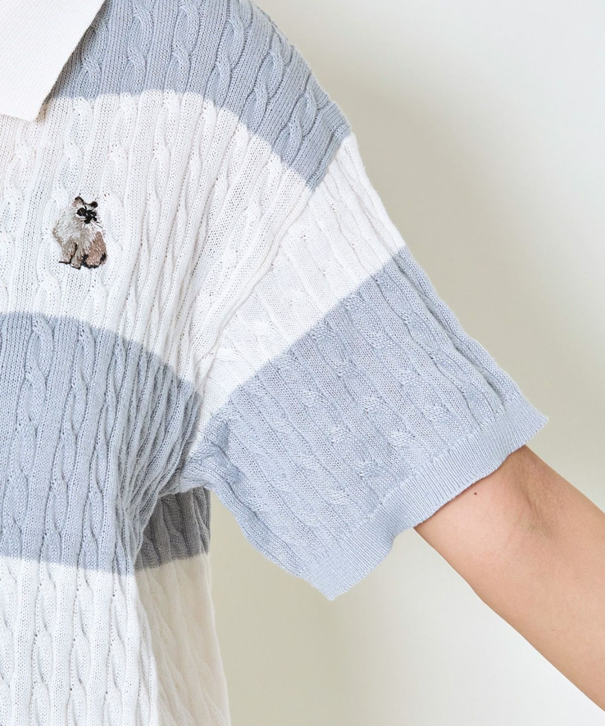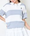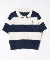 《ワンポイント刺繍×太ボーダー》レディース ケーブル編み 半袖ポロニット 春夏秋