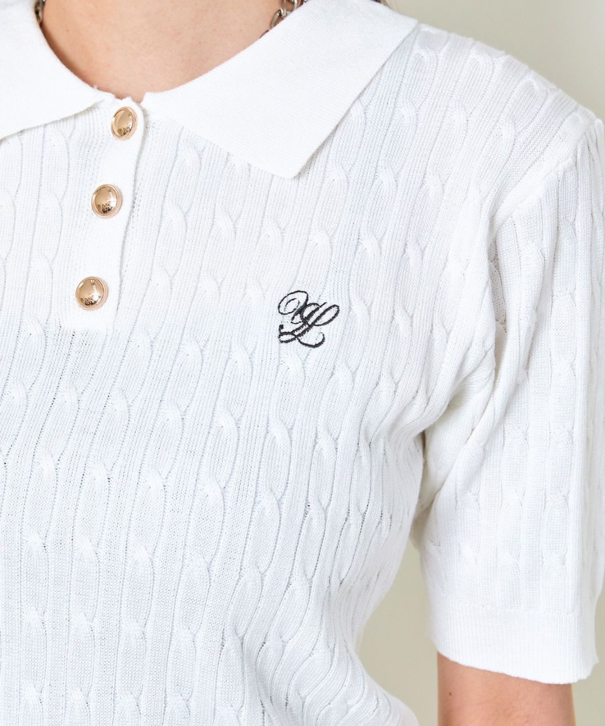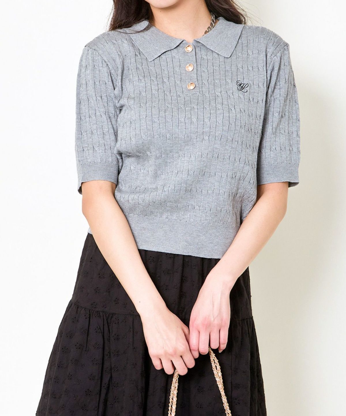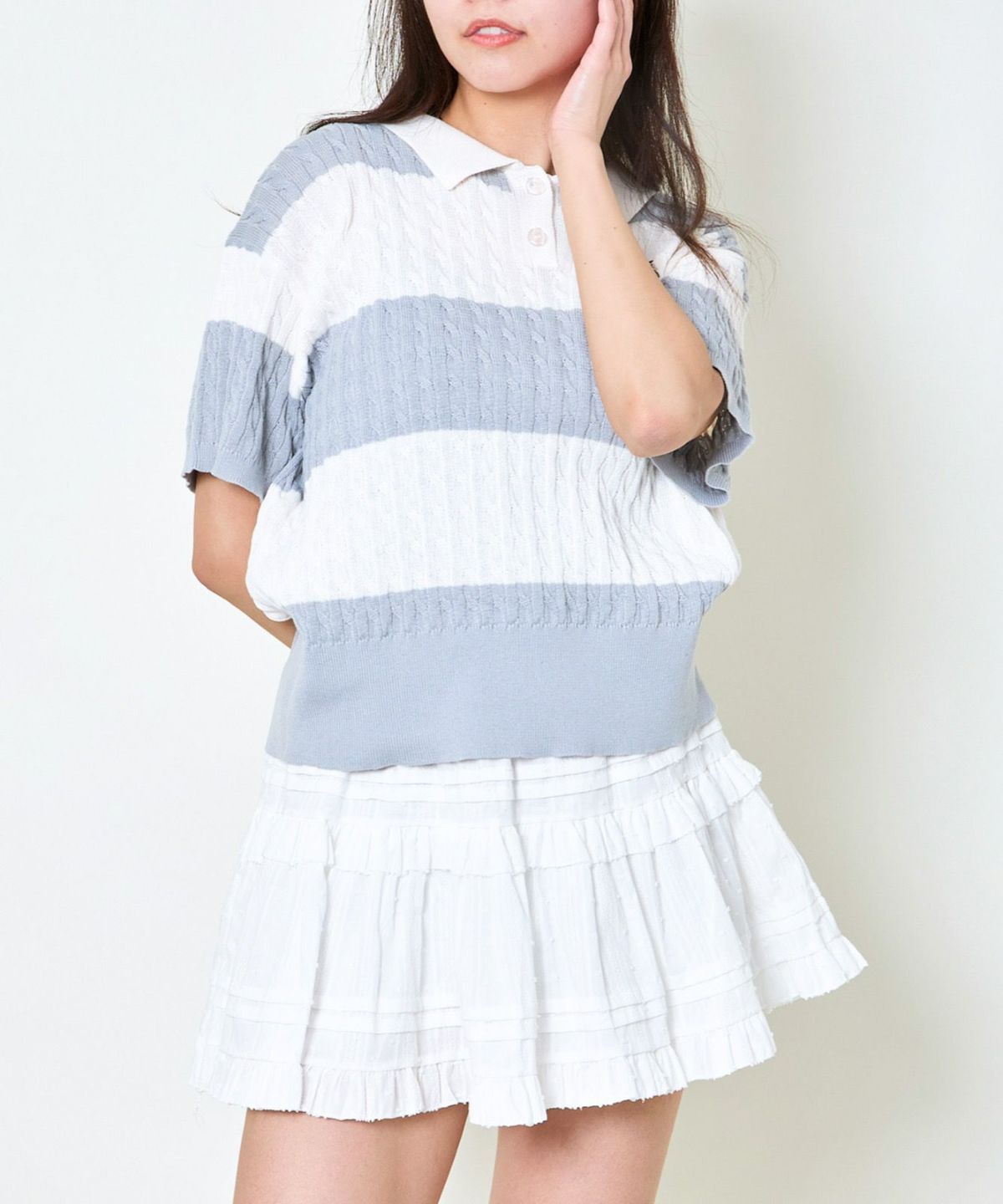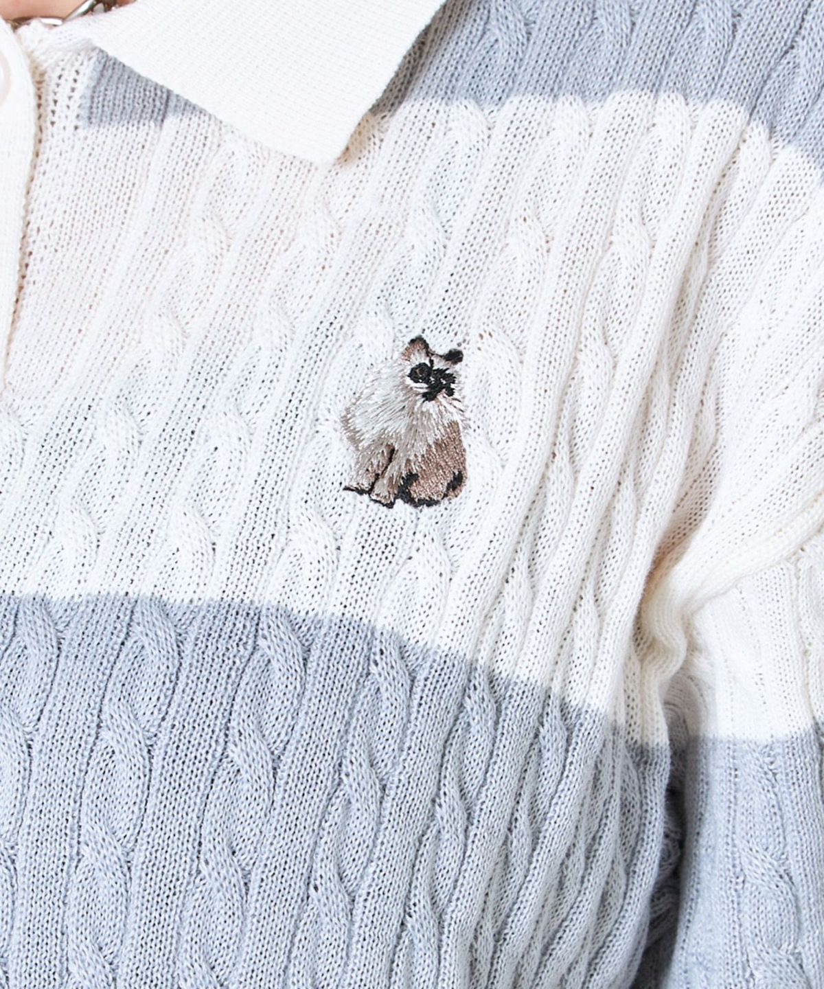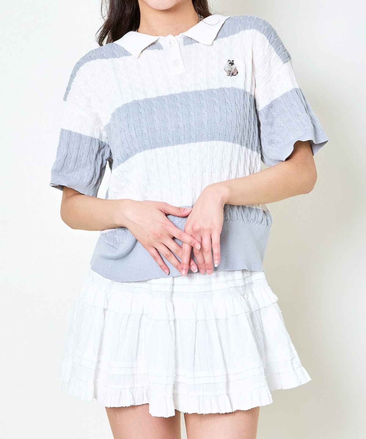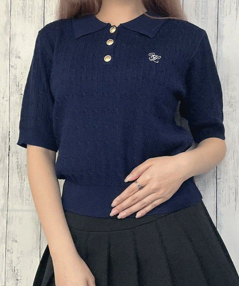 《ワンポイント刺繍×太ボーダー》レディース ケーブル編み 半袖ポロニット 春夏秋