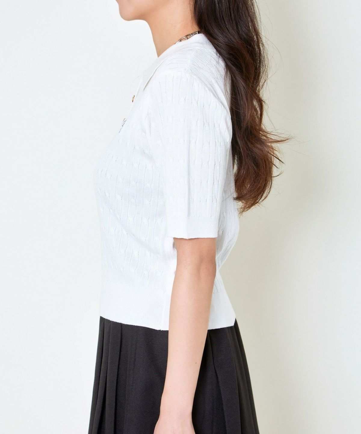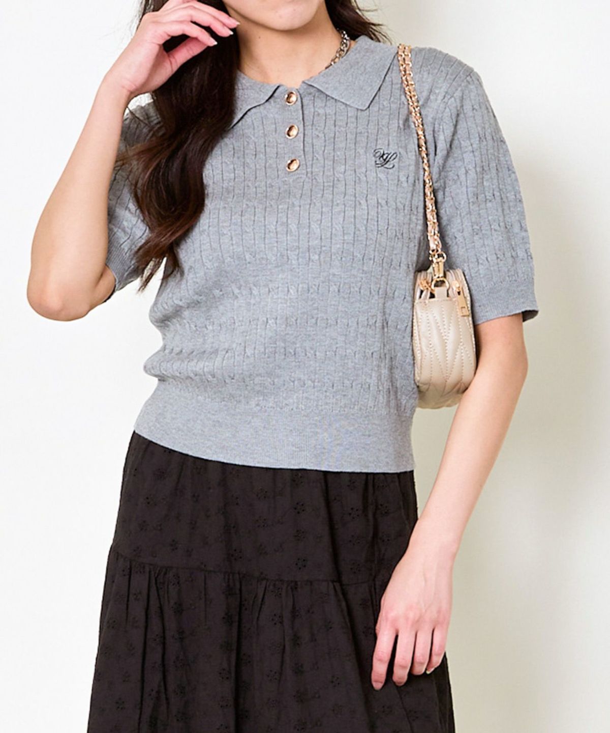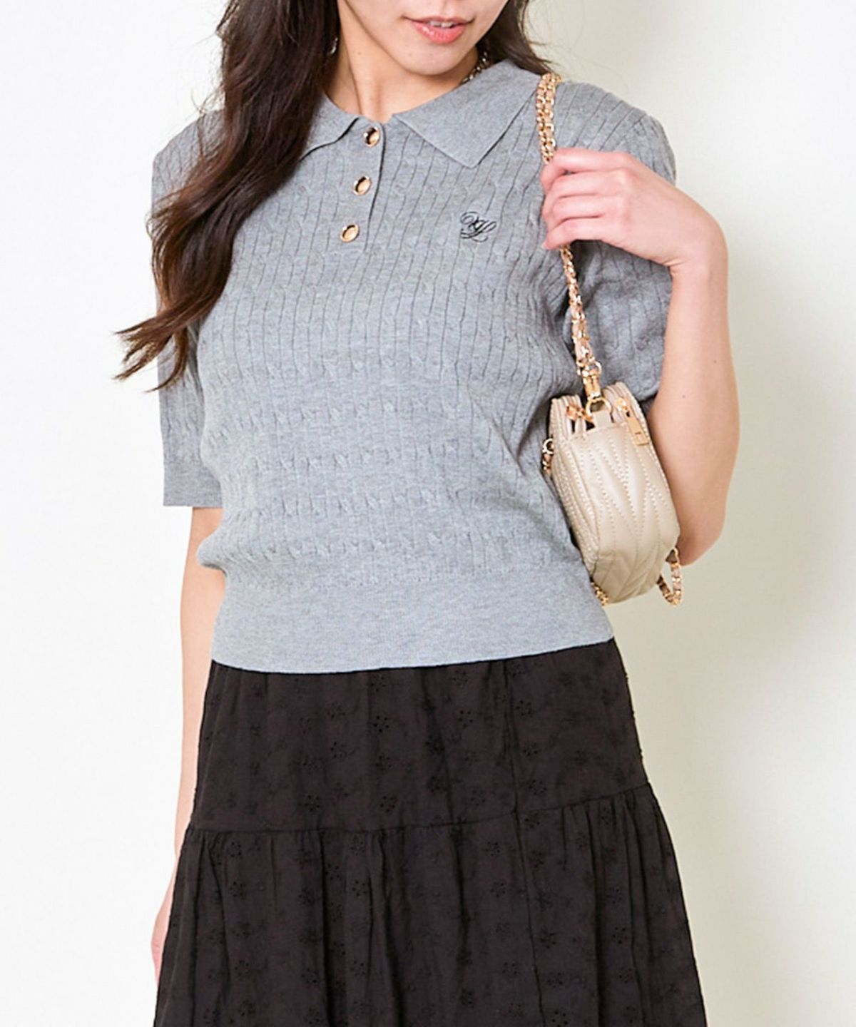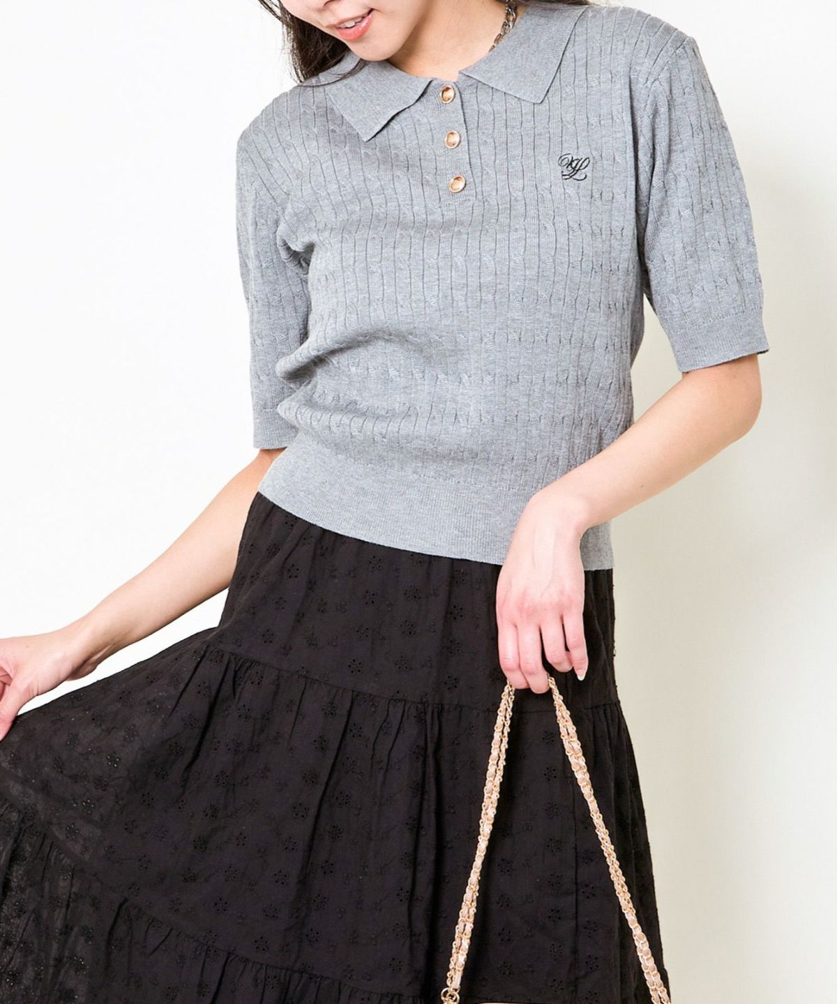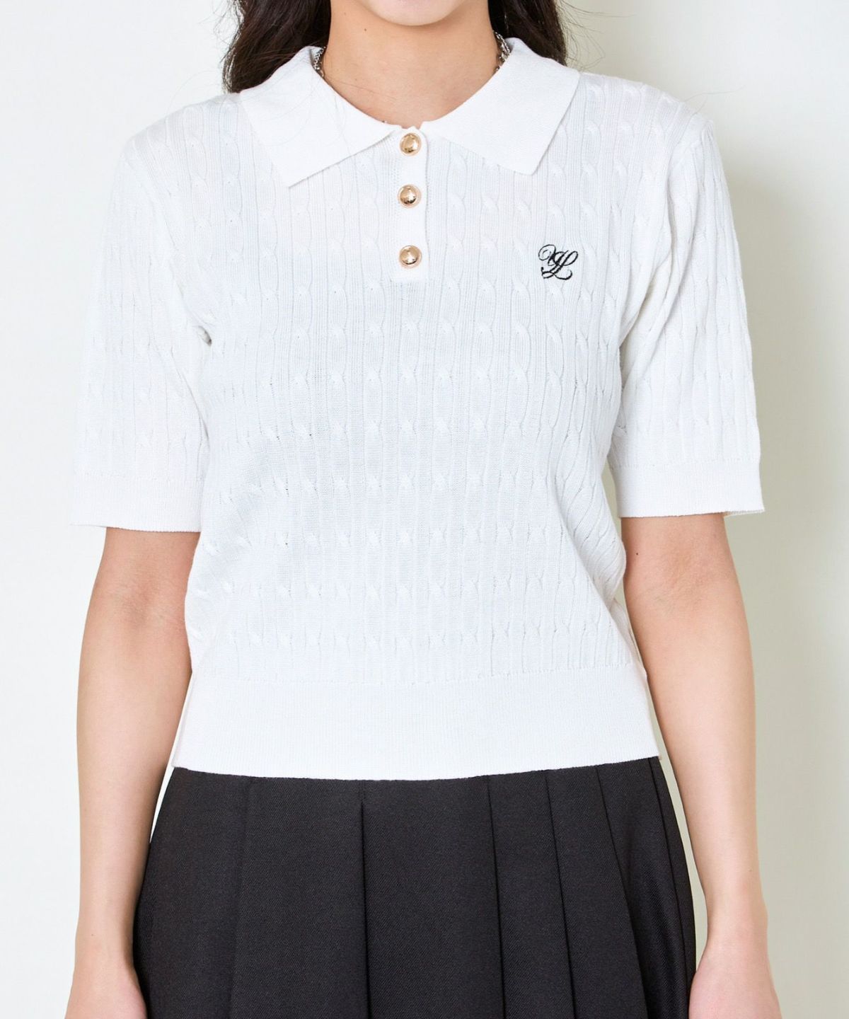 《ワンポイント刺繍×太ボーダー》レディース ケーブル編み 半袖ポロニット 春夏秋