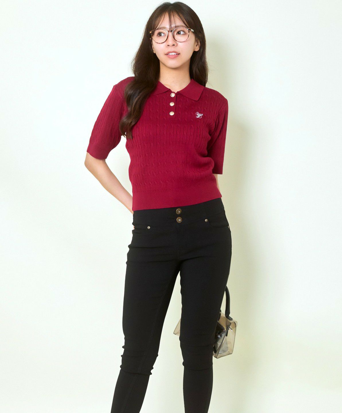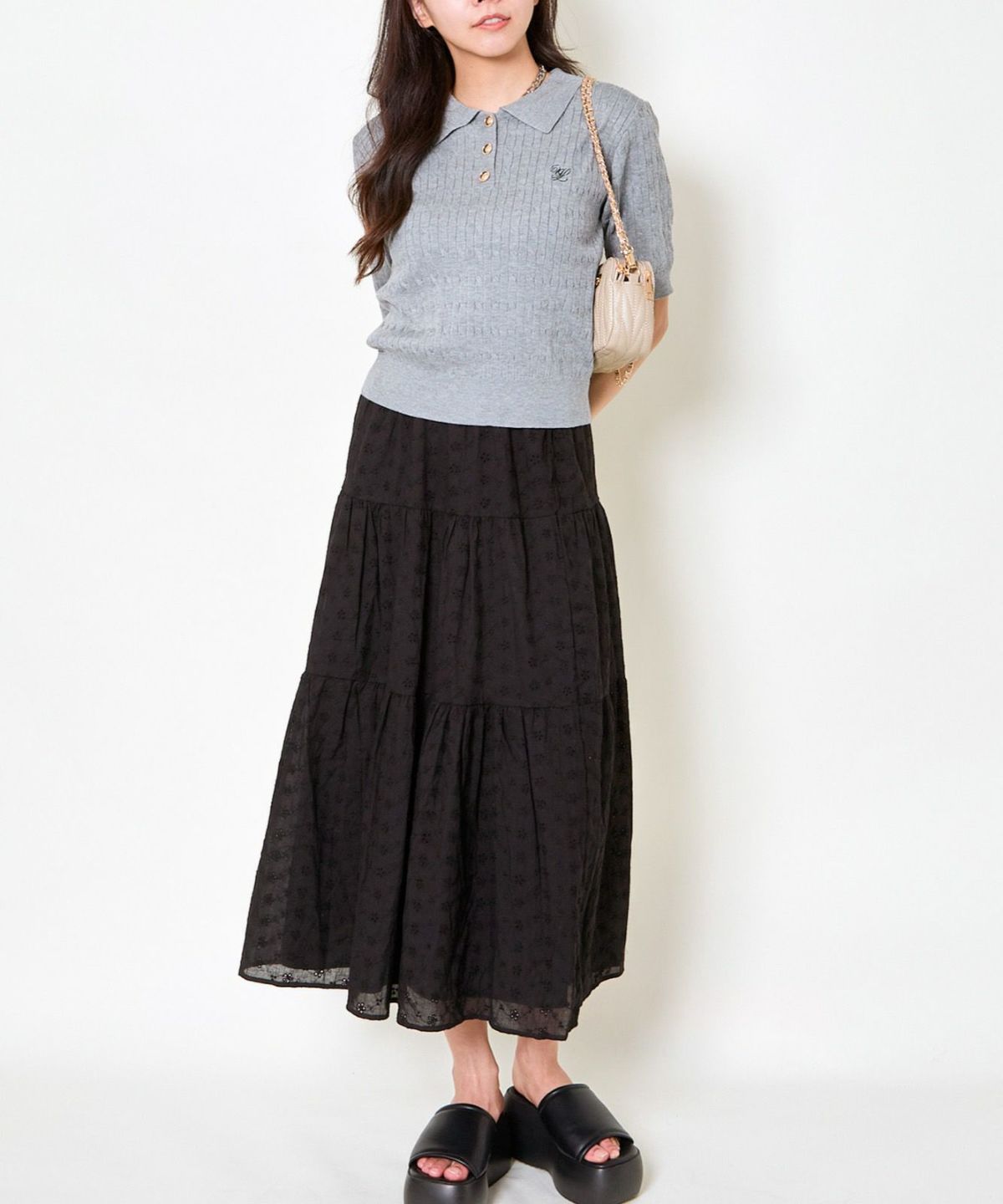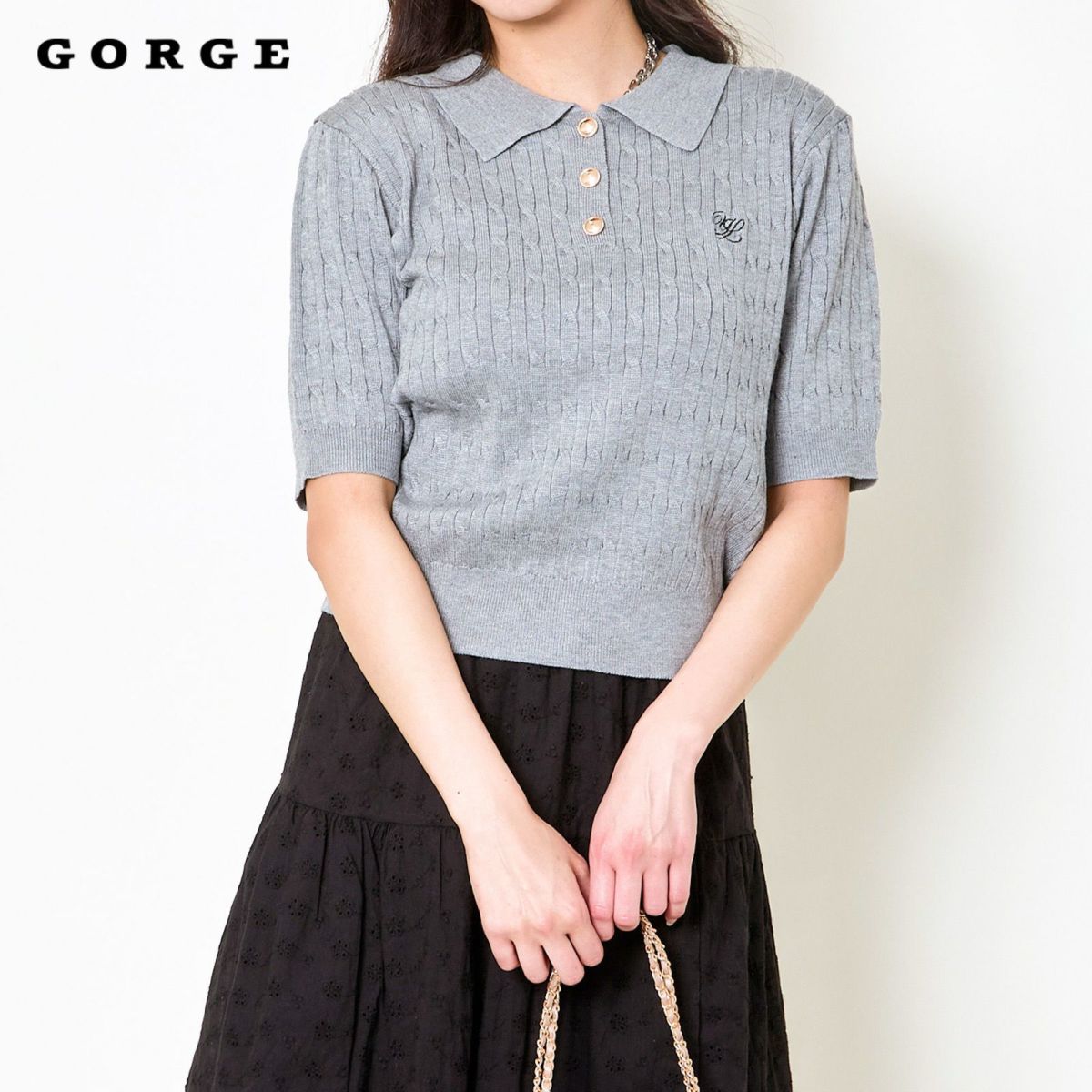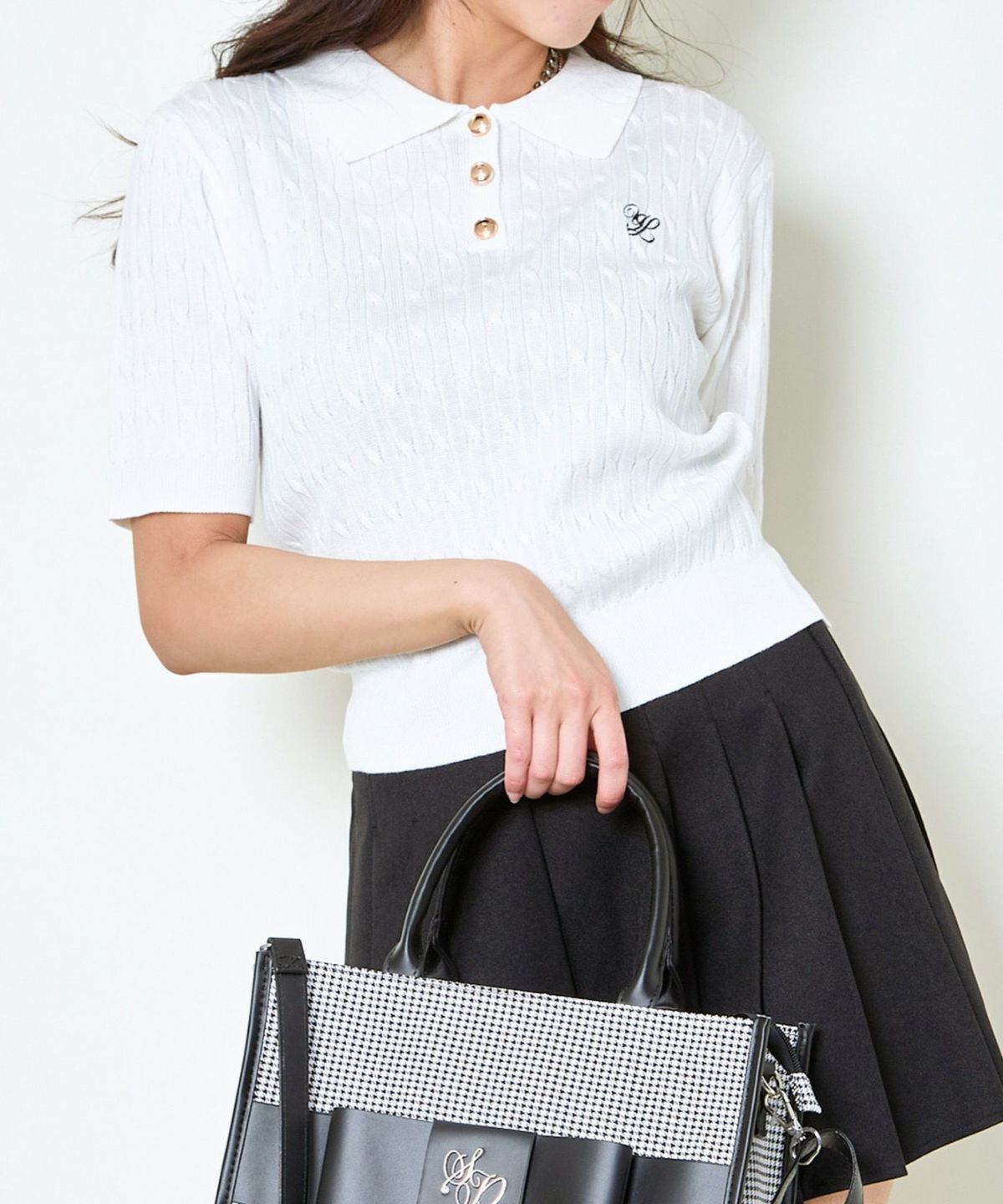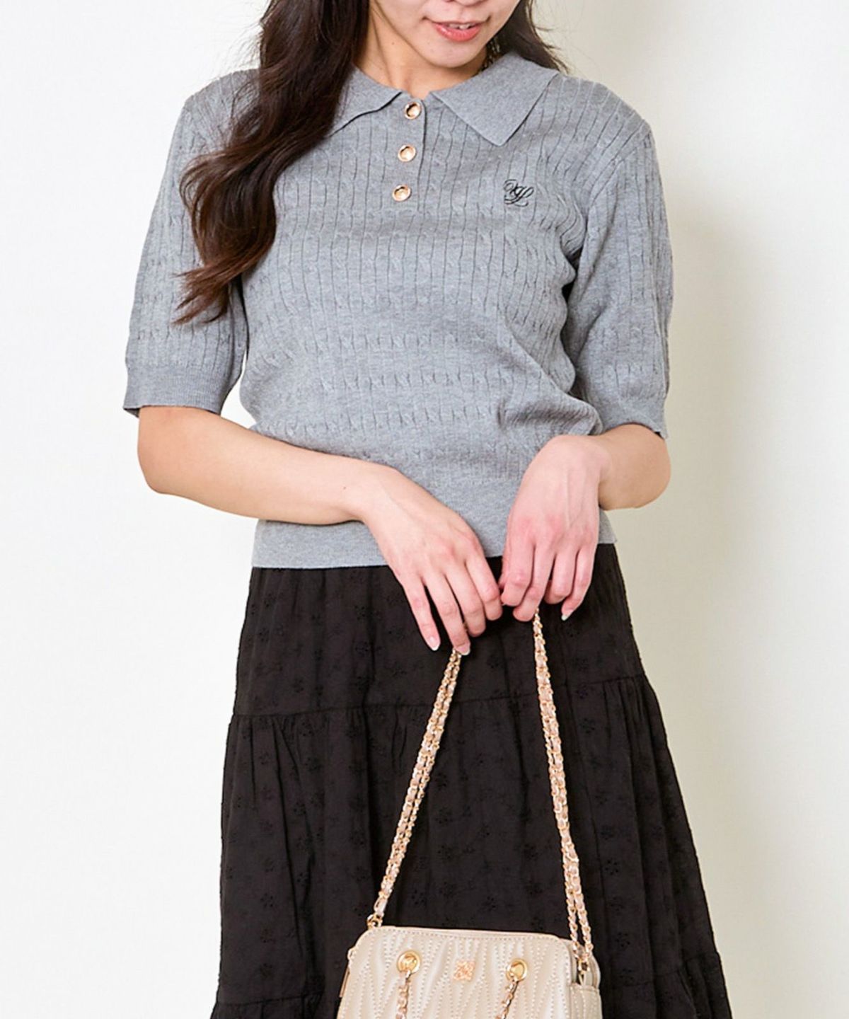 《ワンポイント刺繍×太ボーダー》レディース ケーブル編み 半袖ポロニット 春夏秋