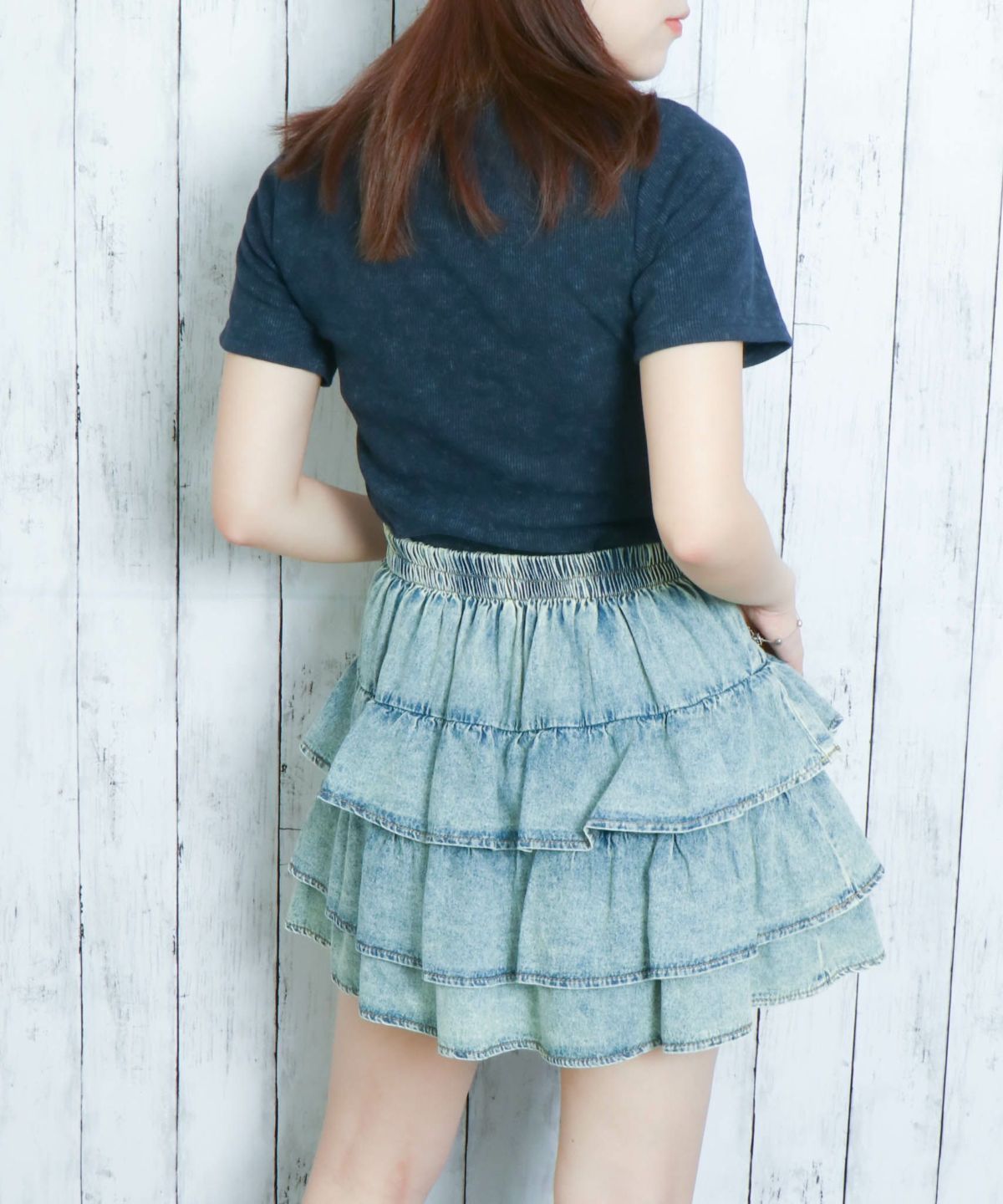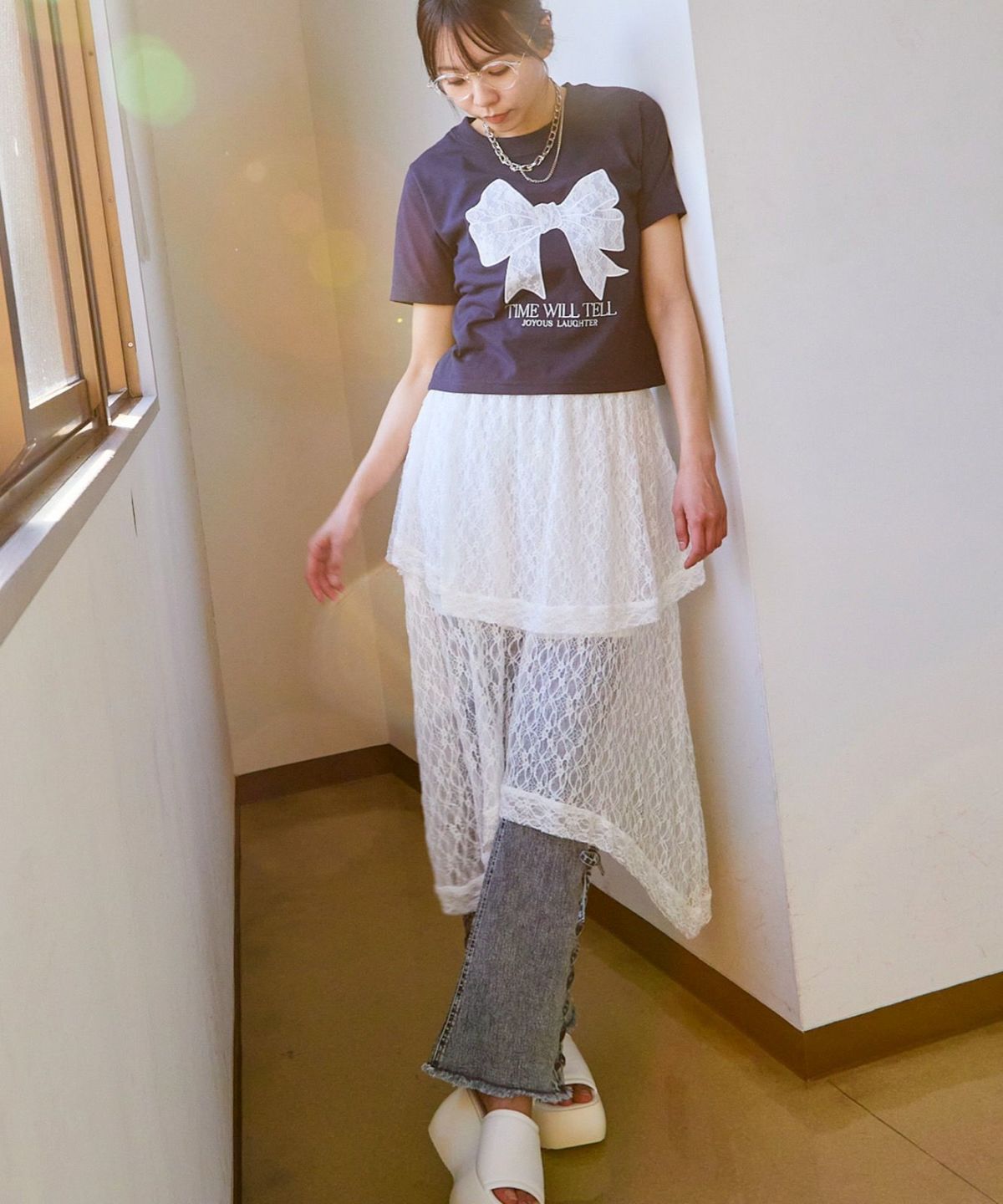 チュールレース付きデニムパンツ