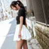 バルーンシルエットが特徴的で、リボンがアクセントとなり、可愛らしさをプラス。ミニ丈なので、脚をきれいに見せつつ、軽やかな印象を与えてくれます。